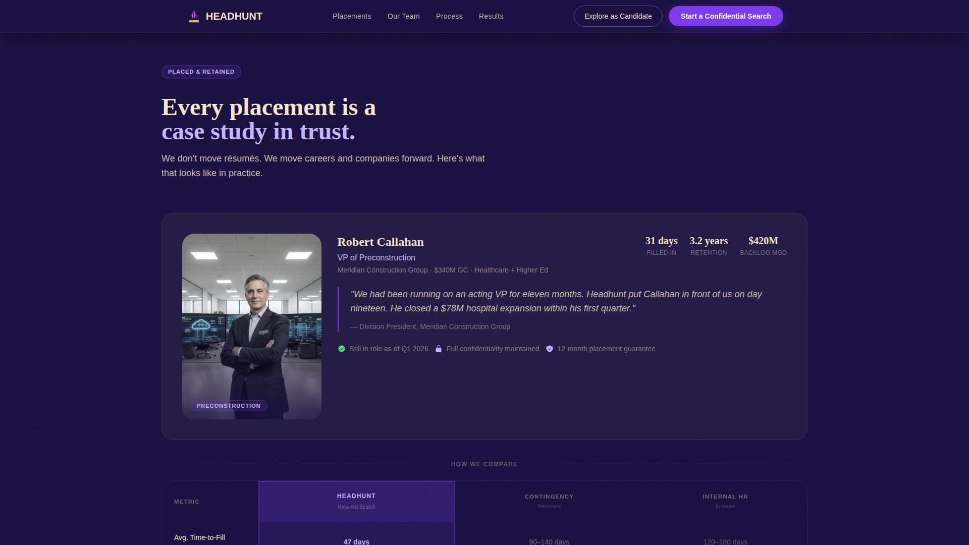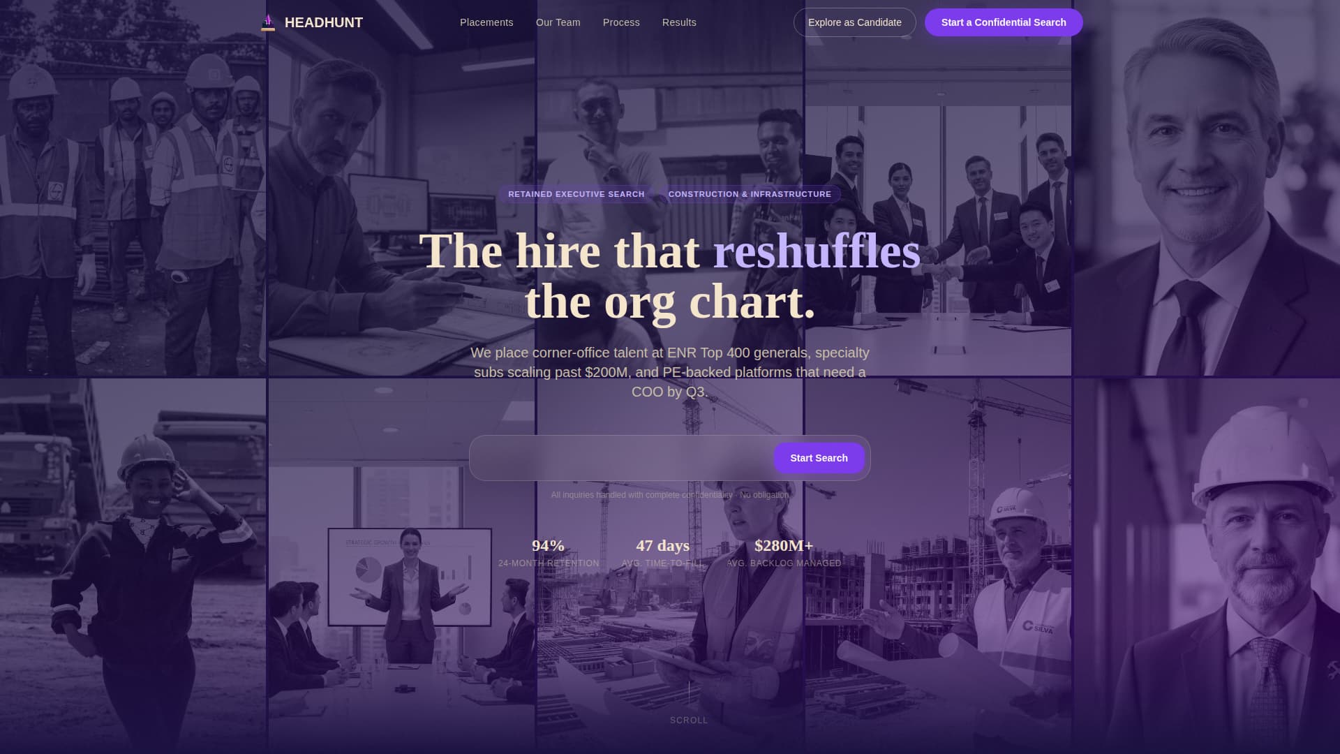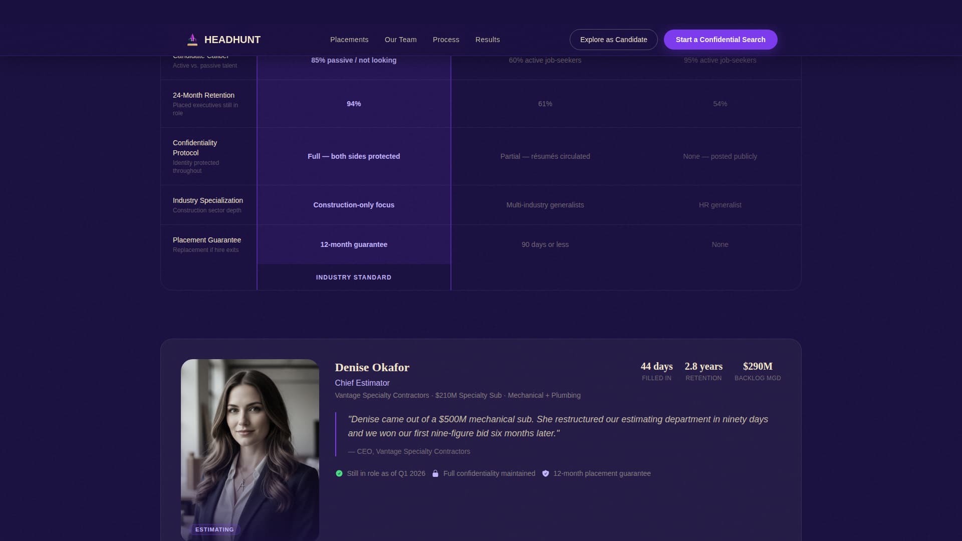 Headhunt is a premium landing page template for construction executive search firms. It opens with a cycling-ghost-text search field set against a black-and-white portrait mosaic, then walks visitors through placed-executive mini case studies and a direct comparison table. The page is built to convert both hiring companies and senior construction executives exploring confidential moves.