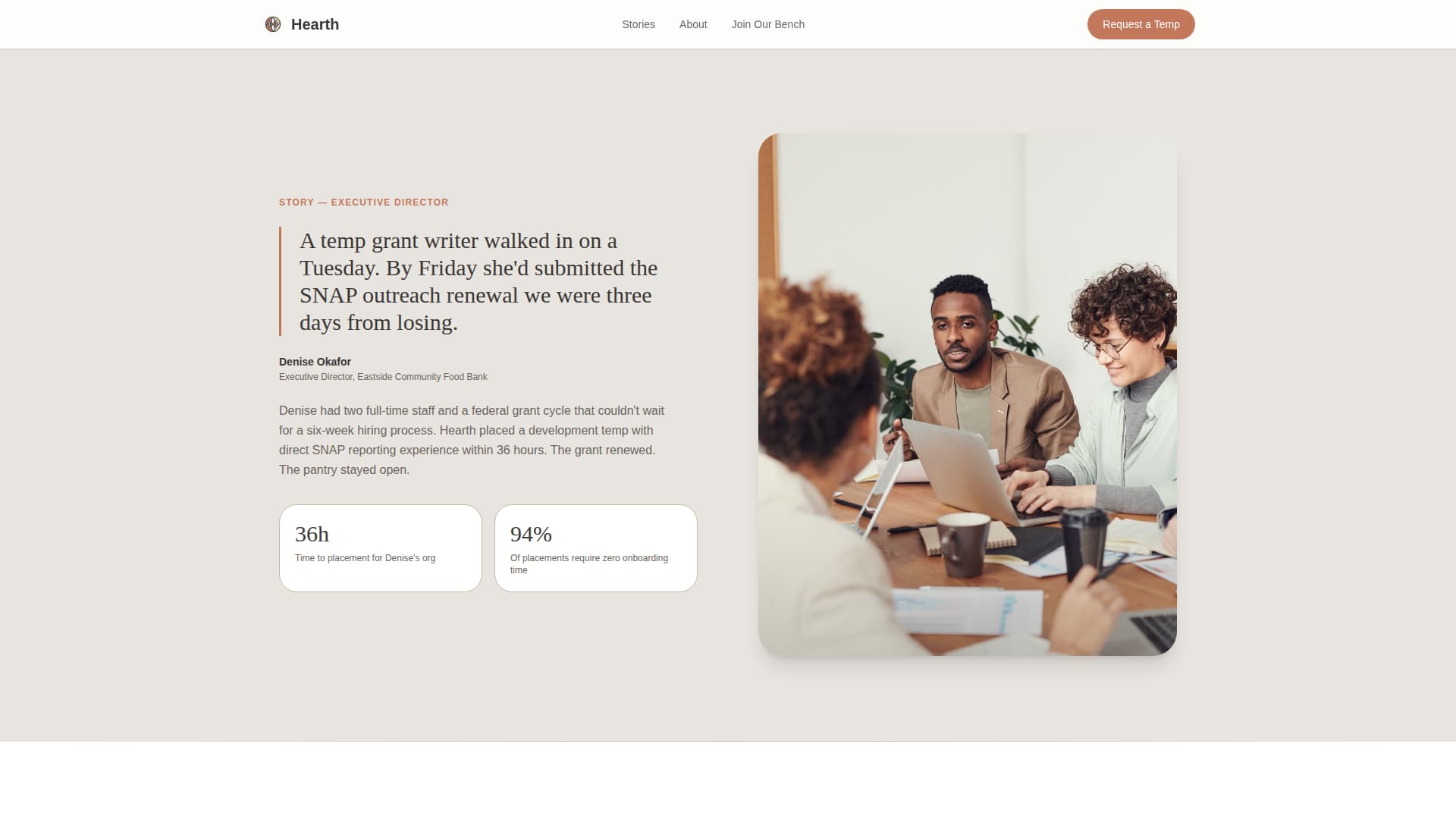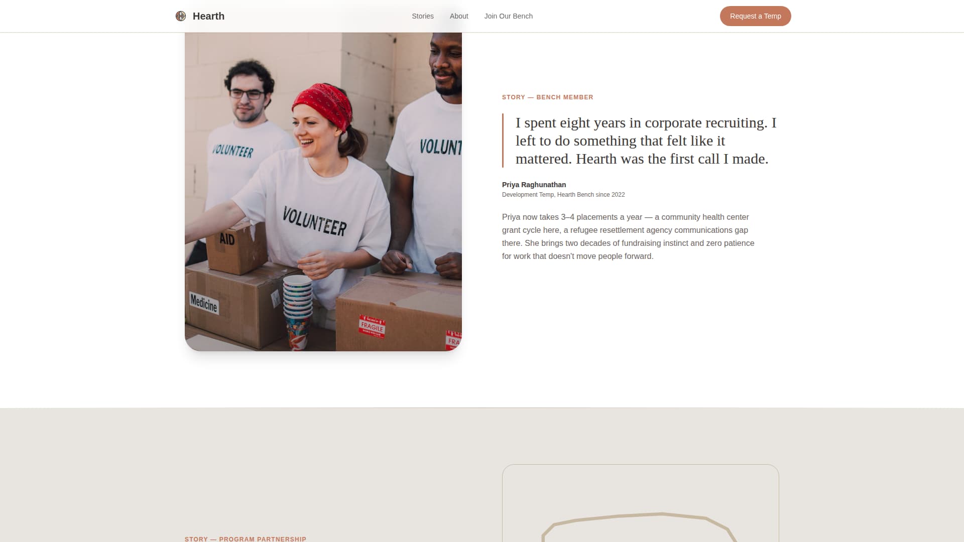 Hearth is a warm, editorial landing page template built for mission-driven temp staffing agencies serving nonprofits. It features a dual conversion path for both temp talent and hiring managers, a scrolling partner logo bar, three zigzag testimonial blocks, and a Soft Mist color system that feels trustworthy and unhurried from the first scroll to the final form.