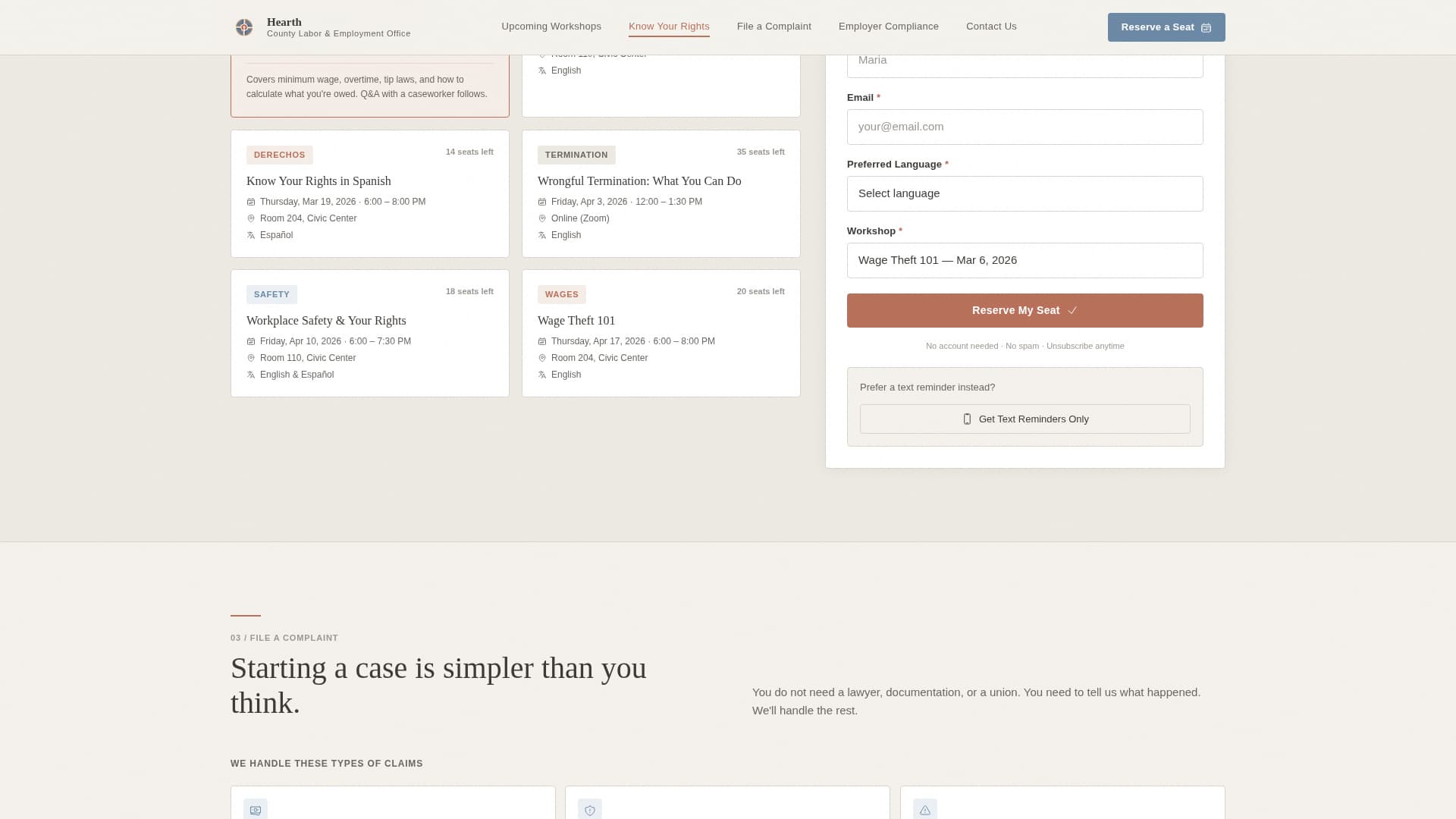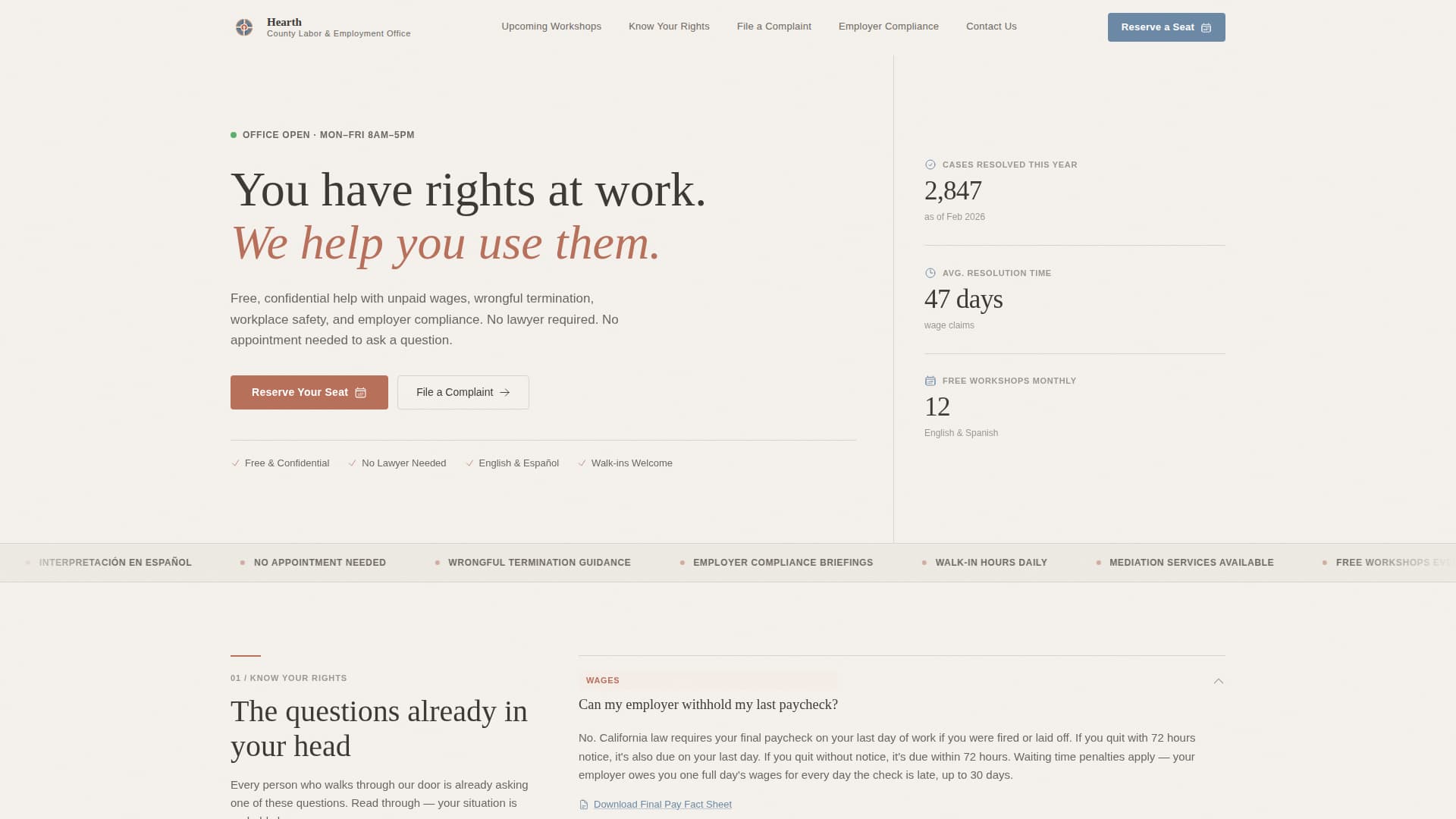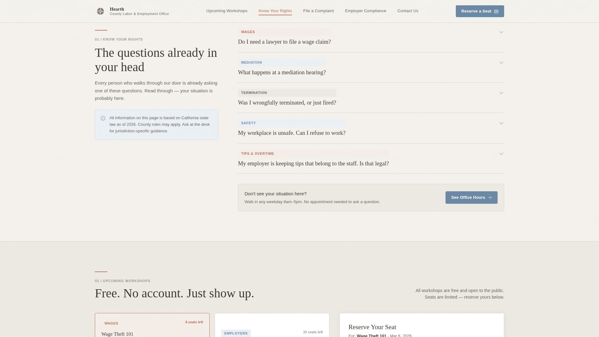 Hearth is a hub-and-spoke anchor-nav landing page template built for county labor and employment offices. It guides workers and small business owners through wage claims, workplace rights, and compliance questions using an FAQ-driven layout. The primary conversion path is free workshop registration, with a clean calendar grid and a short, no-account-required sign-up form.