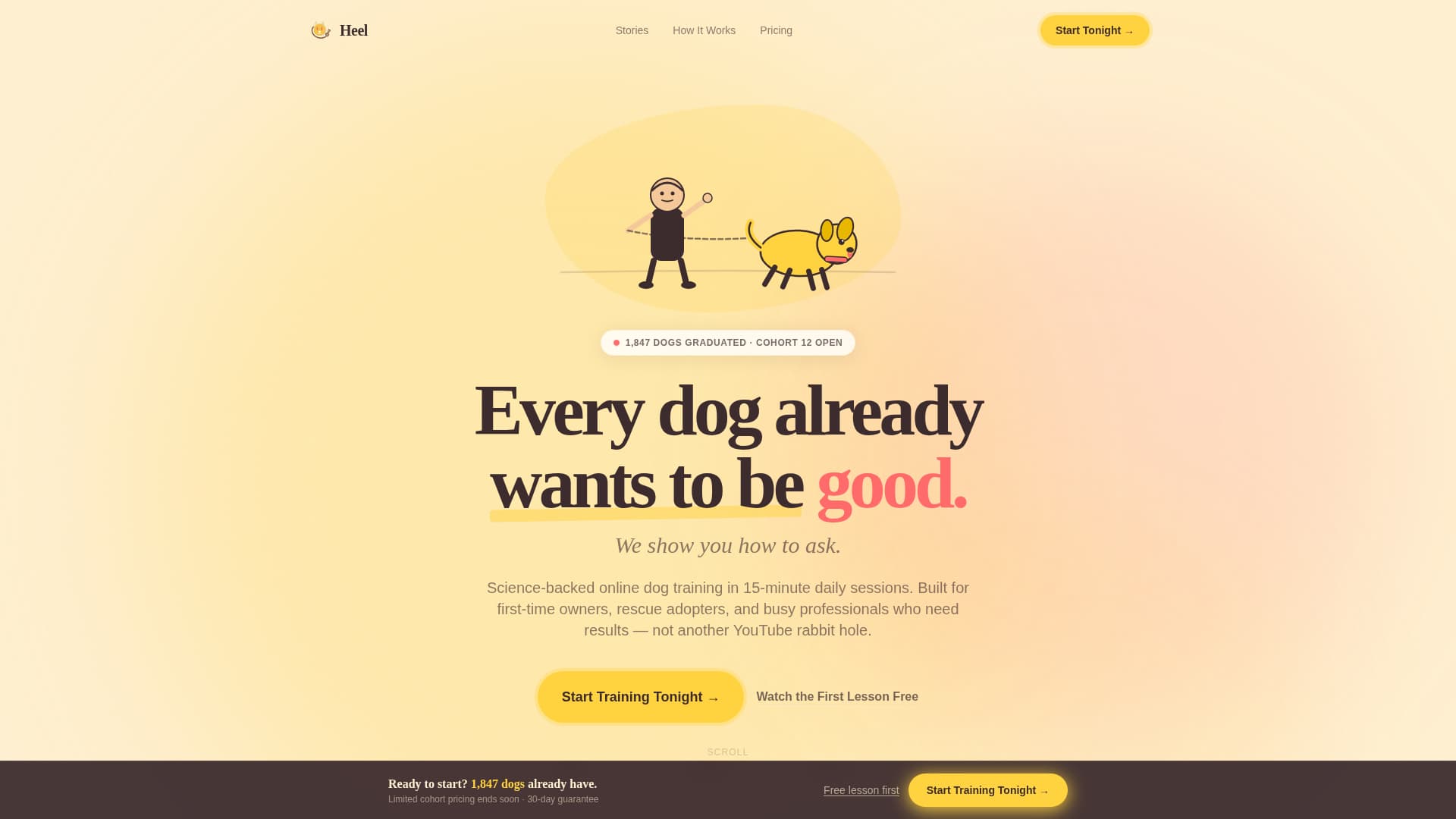 Heel is a single-page template for online dog training course creators. It pairs an animated illustrated header with a scrollable community gallery, a tiered checkout, and a persistent call-to-action bar. The visual identity is warm, hand-drawn, and emotionally resonant, built to turn a frustrated dog owner into a paying student.
