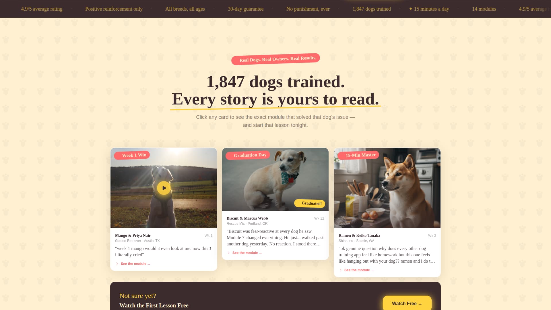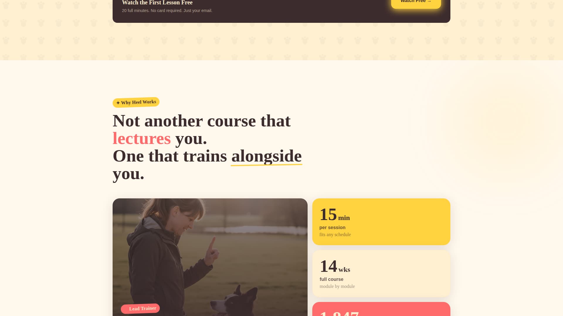Most dog training course pages either lecture visitors with credentials or bury the proof beneath long paragraphs. Neither approach closes sales. Heel solves this by letting real student outcomes do the selling, while keeping the path to purchase clear and frictionless.