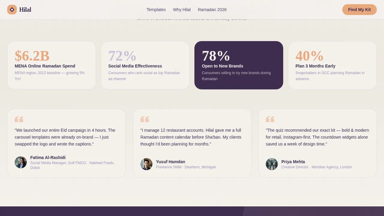 Hilal is a ready-to-post Ramadan marketing campaign landing page template built as a bento grid showcase. It gives social media managers, in-house marketers, and agencies a complete set of carousel templates, story frames, countdown widgets, and caption banks. A three-step quiz helps visitors find their ideal Ramadan kit in minutes, with warm geometric design that feels intentional and culturally respectful.