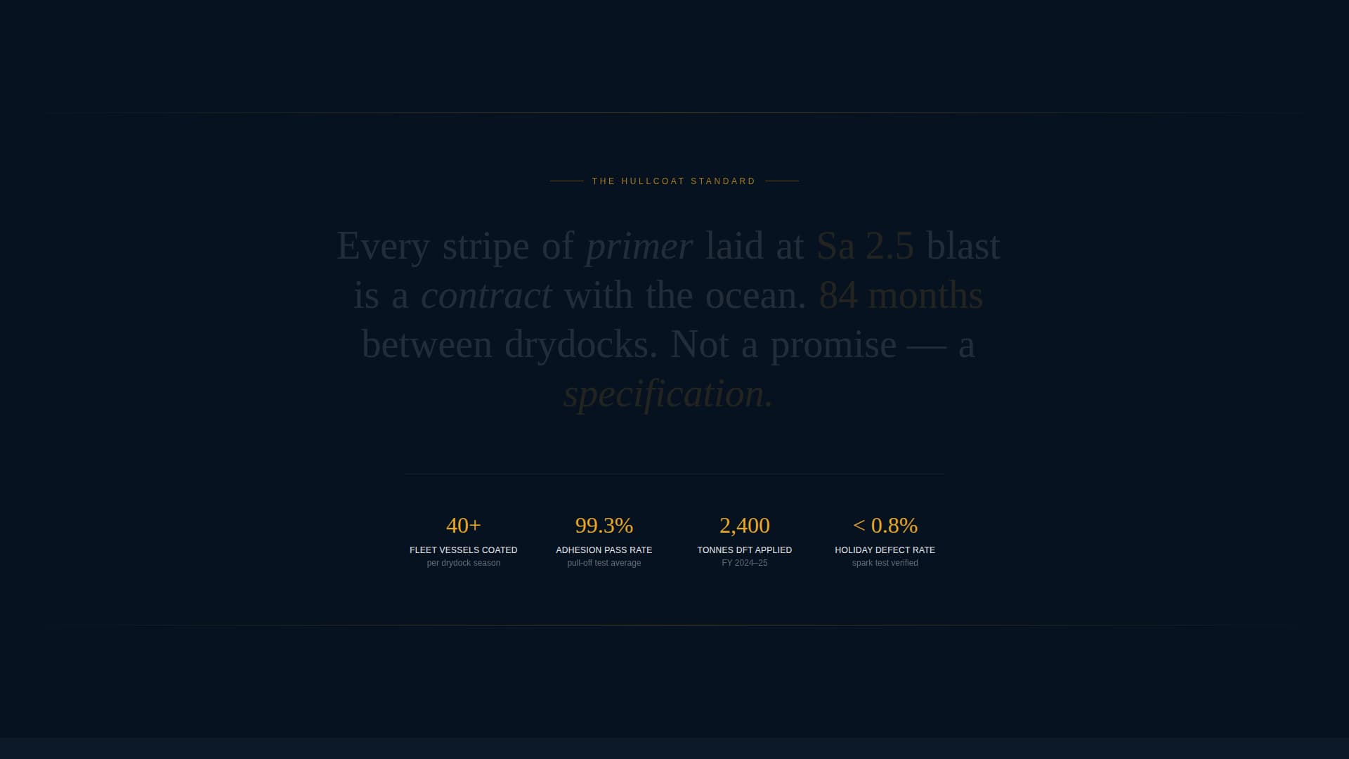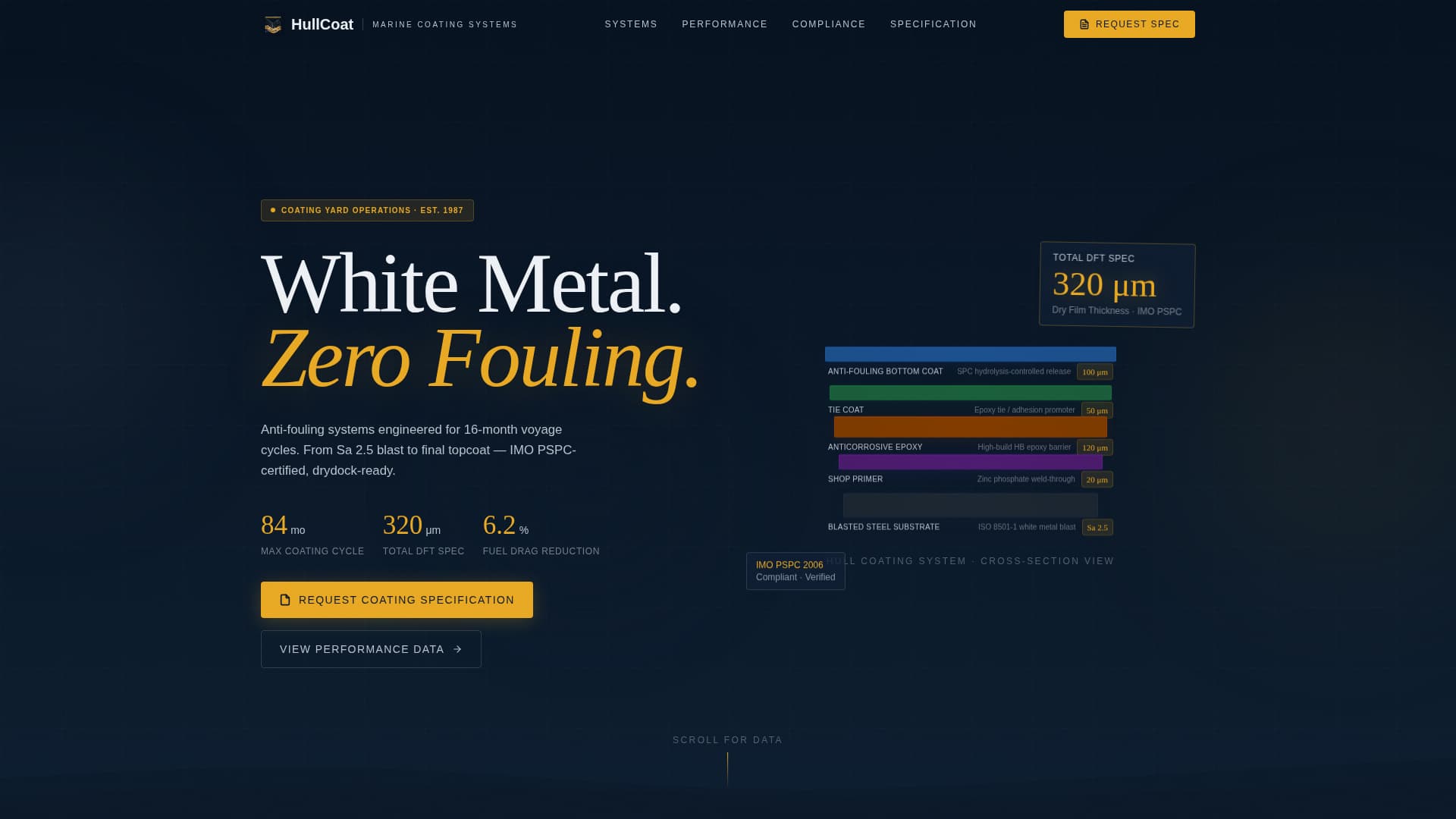 Hullcoat is a marine coating landing page built for shipyard professionals who need more than a brochure. It presents anti-fouling and epoxy coating services through an industry-report structure: performance data grids, compliance matrices, and a technical exploded-view header. The result is a page that earns trust before it asks for a lead.