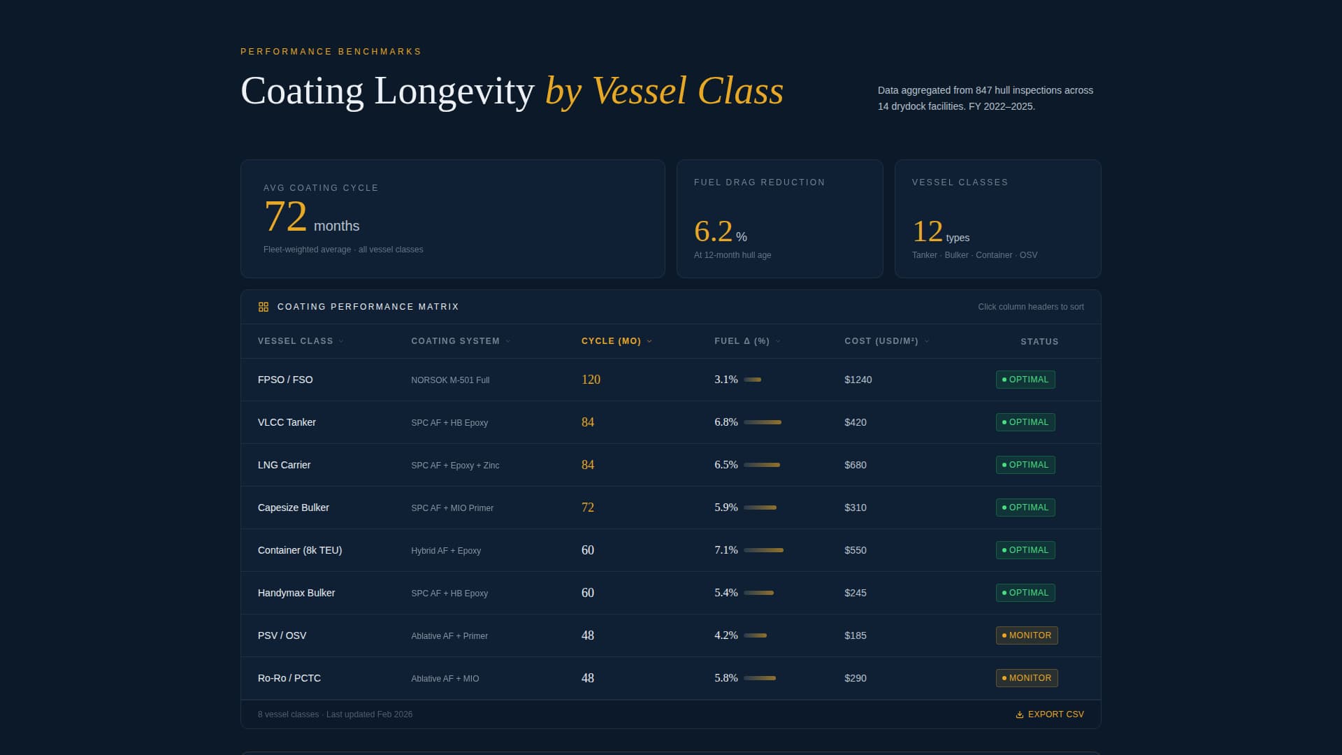 | Coating longevity grid | Present benchmark data on anti-fouling system lifespan across vessel classes |