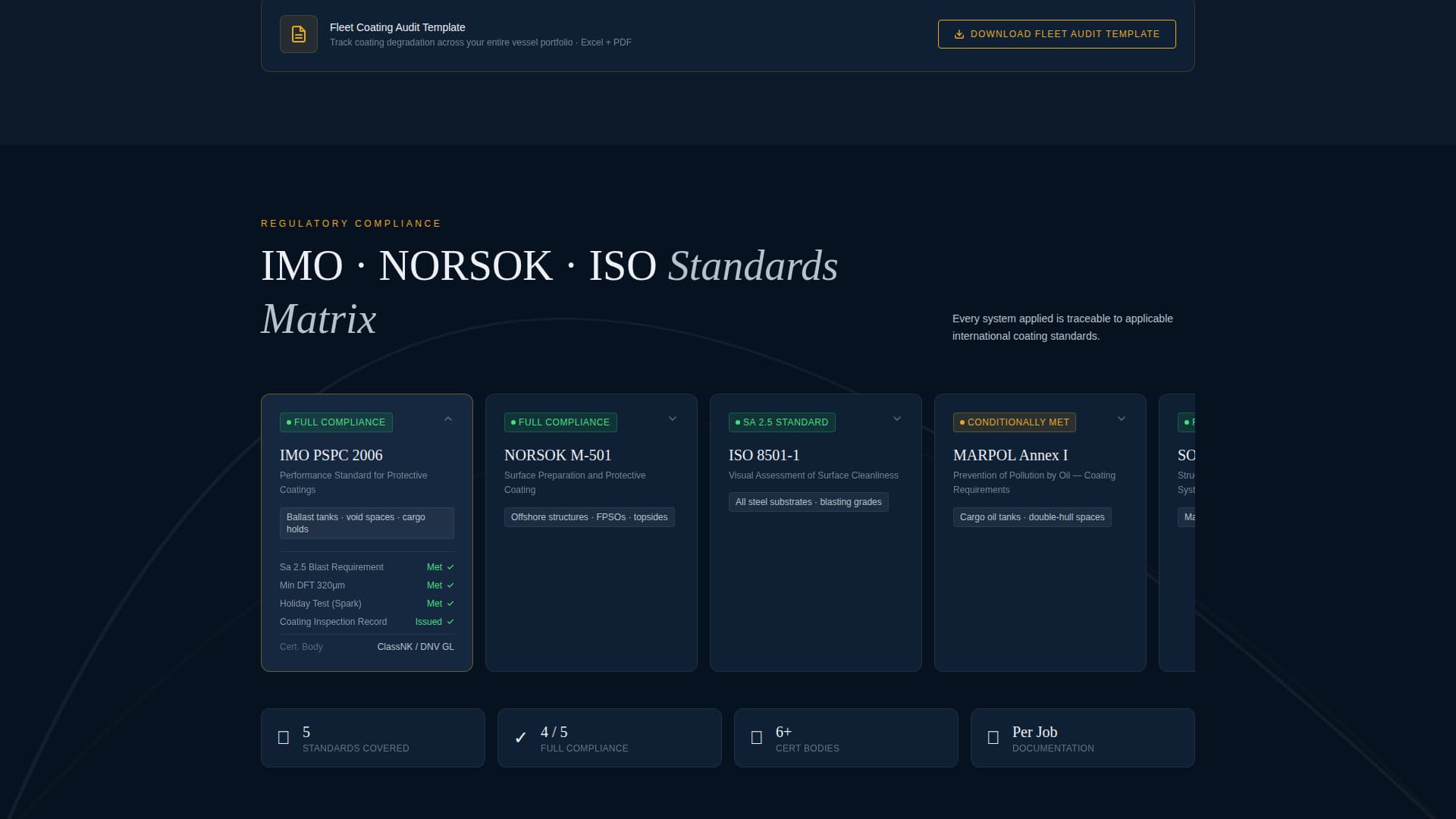 A dedicated compliance section maps coating systems to International Maritime Organization Performance Standard for Protective Coatings (IMO PSPC) and NORSOK standards. This allows shipyard procurement officers to cross-reference their drydock requirements directly on the page, removing a major barrier to inquiry.