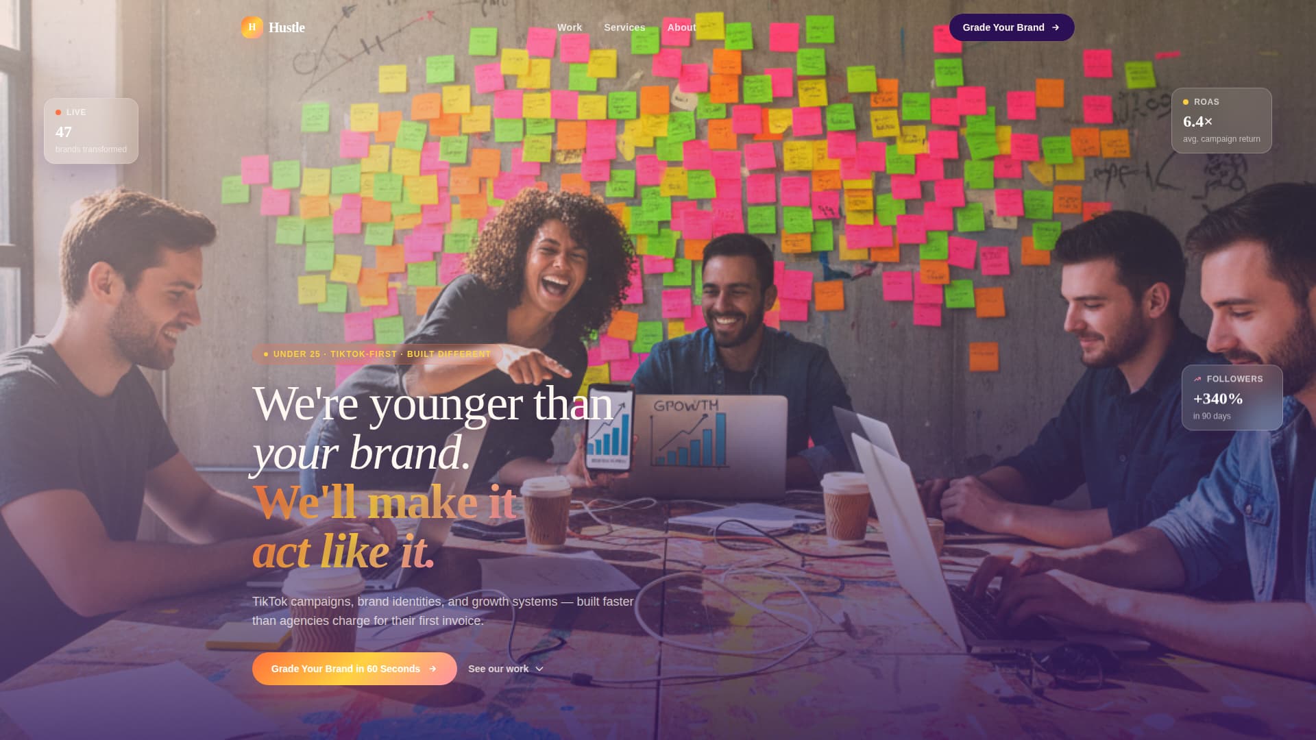 Hustle is a modular card-grid landing page designed for young, fast-moving marketing agencies. It uses a Soft Gradient visual identity, a Before/After project reveal mechanic, and a built-in five-question brand quiz. Every section pushes the visitor forward, from a full-bleed team photo at the top to a sticky "Grade Your Brand in 60 Seconds" call to action at the bottom.