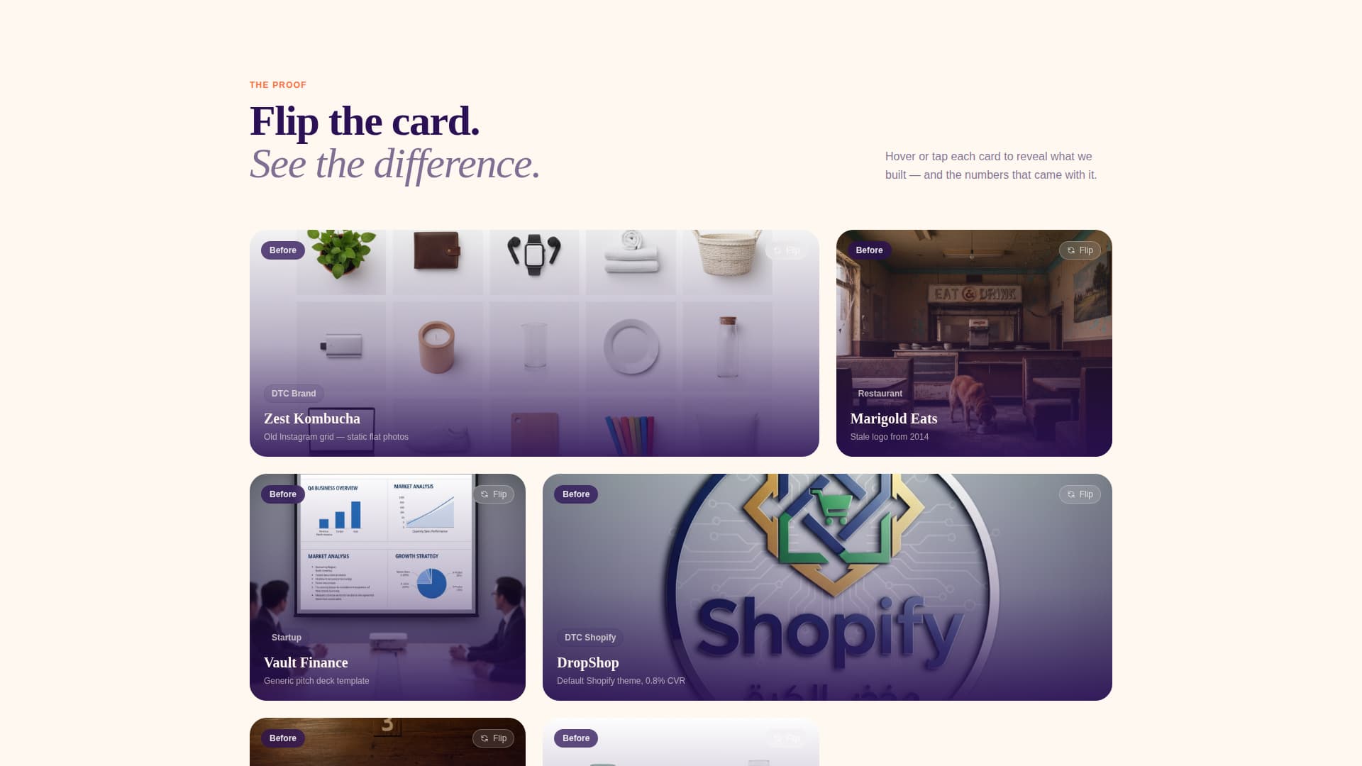 | Modular Card Grid | Showcases client Before/After project results in a flippable, scrollable portfolio |