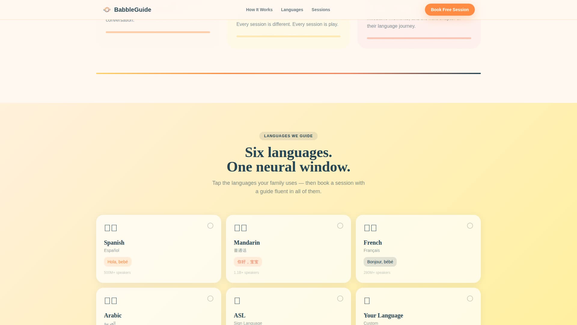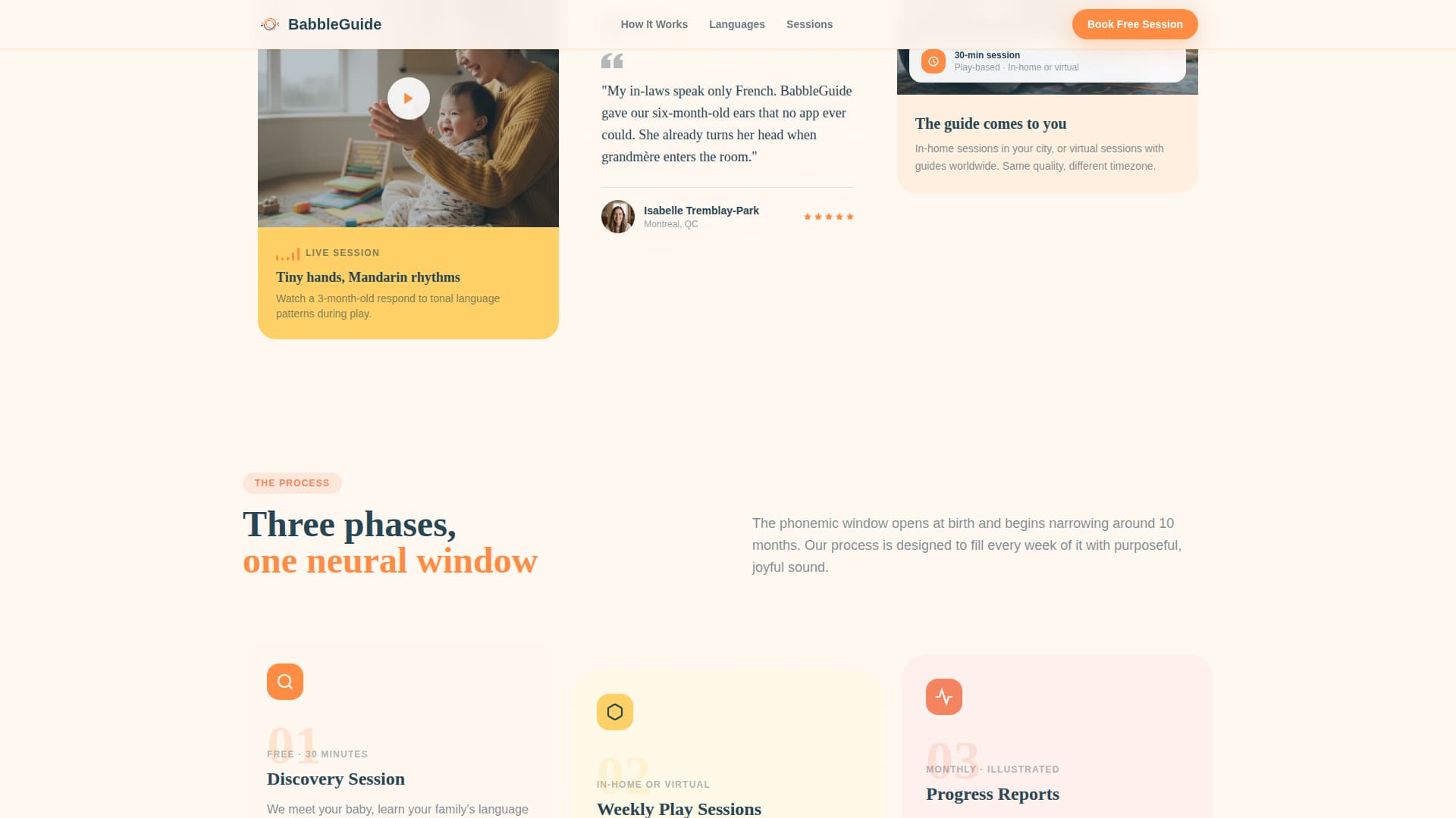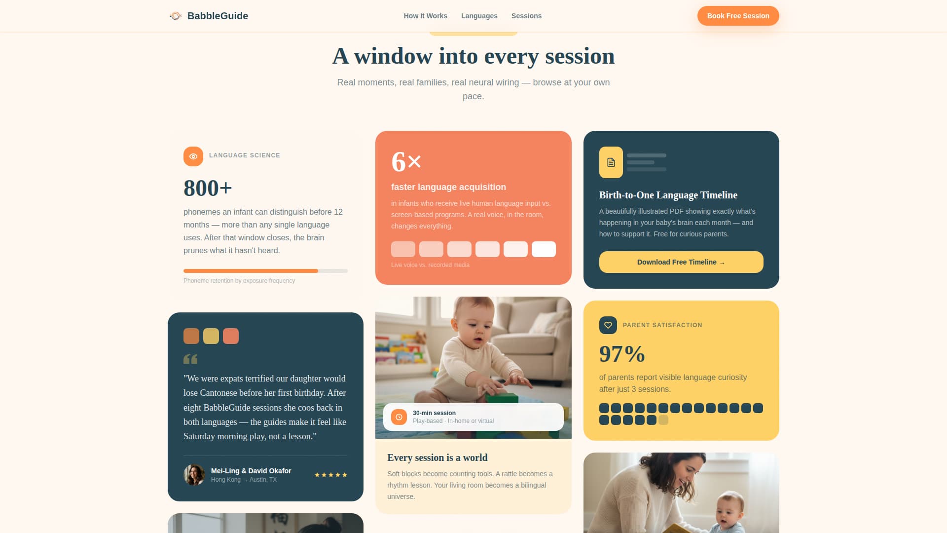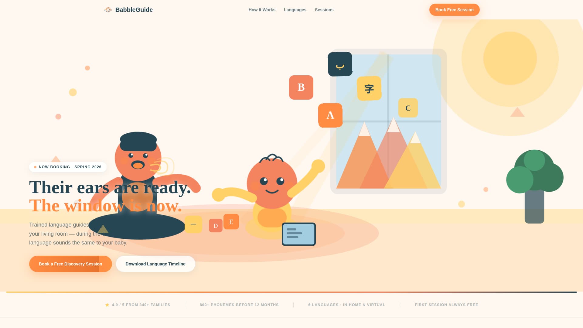 Babble is a masonry-style landing page template built for infant language learning services. It combines a warm Citrus Burst color system, a custom flat-geometric illustration header, and a Pinterest-style gallery layout to guide research-driven parents from curiosity to a booked discovery session. The two-step booking modal, language toggles, and email lead capture make the page both beautiful and purposeful.