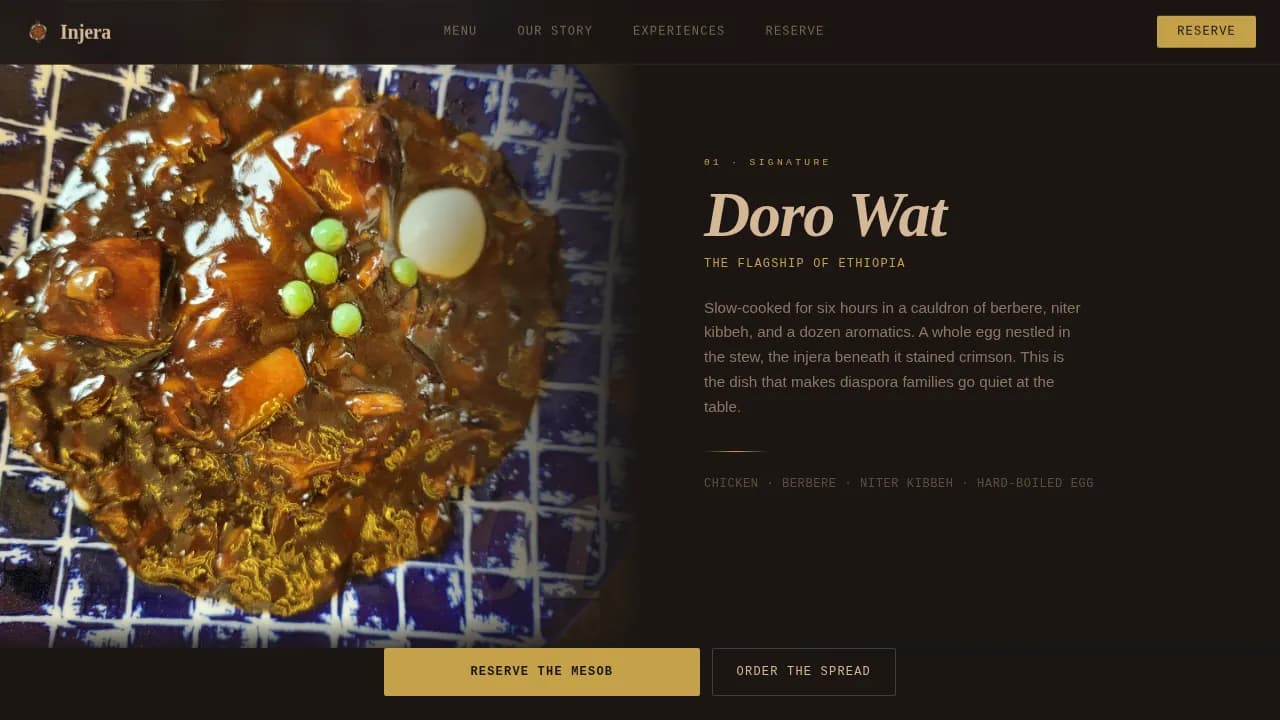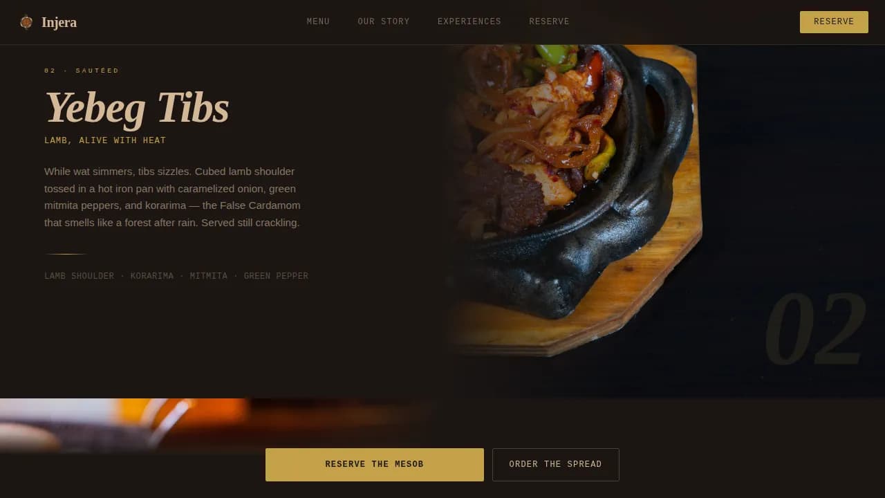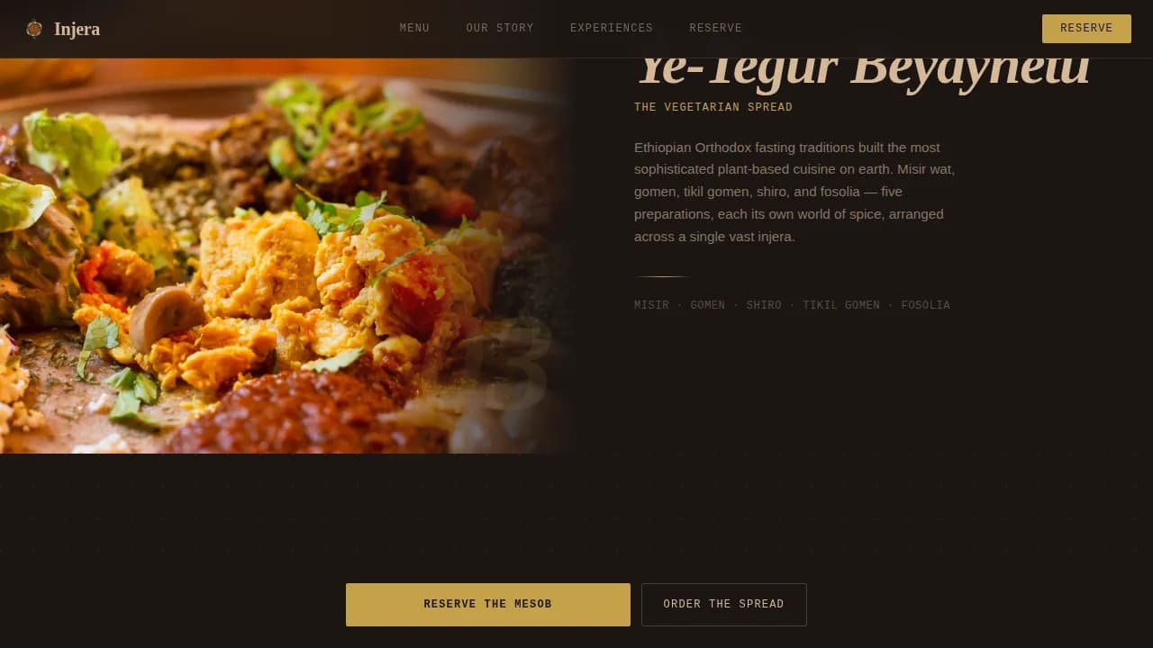The Injera template is a cinematic single-scroll landing page designed for communal Ethiopian dining restaurants. It combines a cinemagraph hero, viewport-filling dish visuals, and a multi-conversion layout that guides visitors toward a dine-in reservation, online ordering, or private event inquiry. Rich earth tones and scroll-linked animations create an immersive, sensory experience before any call to action appears.