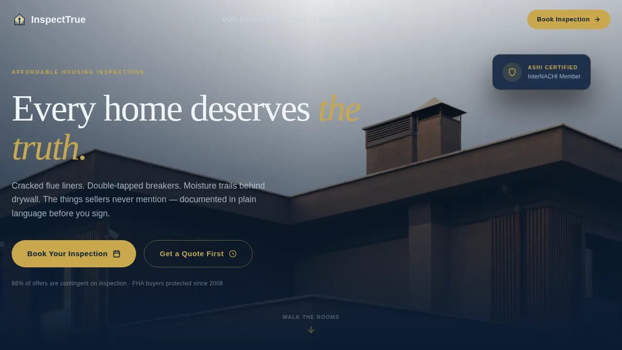 A gallery and detail landing page built for affordable housing home inspectors. This template walks site visitors room by room through real inspection findings, builds trust before asking for commitment, and converts that trust into booked inspections. It is designed for inspection companies serving first-time buyers, housing nonprofits, and municipal agencies across the affordable housing market.