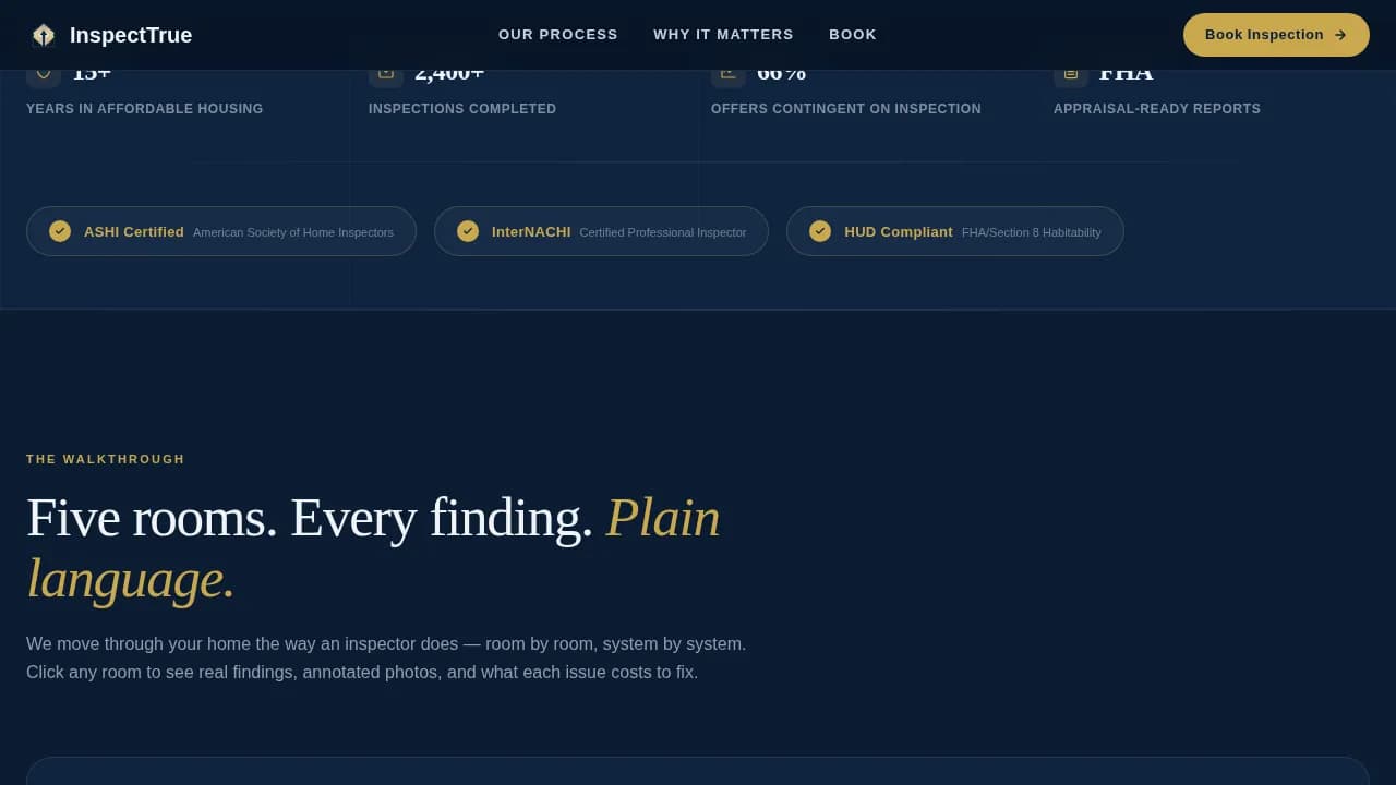 This single-page template gives home inspectors a confident, room-by-room showcase of their work. Visitors move through five inspection areas, read plain-language findings, and reach the booking form already convinced. The design is calm, authoritative, and built specifically for the affordable housing inspection business.