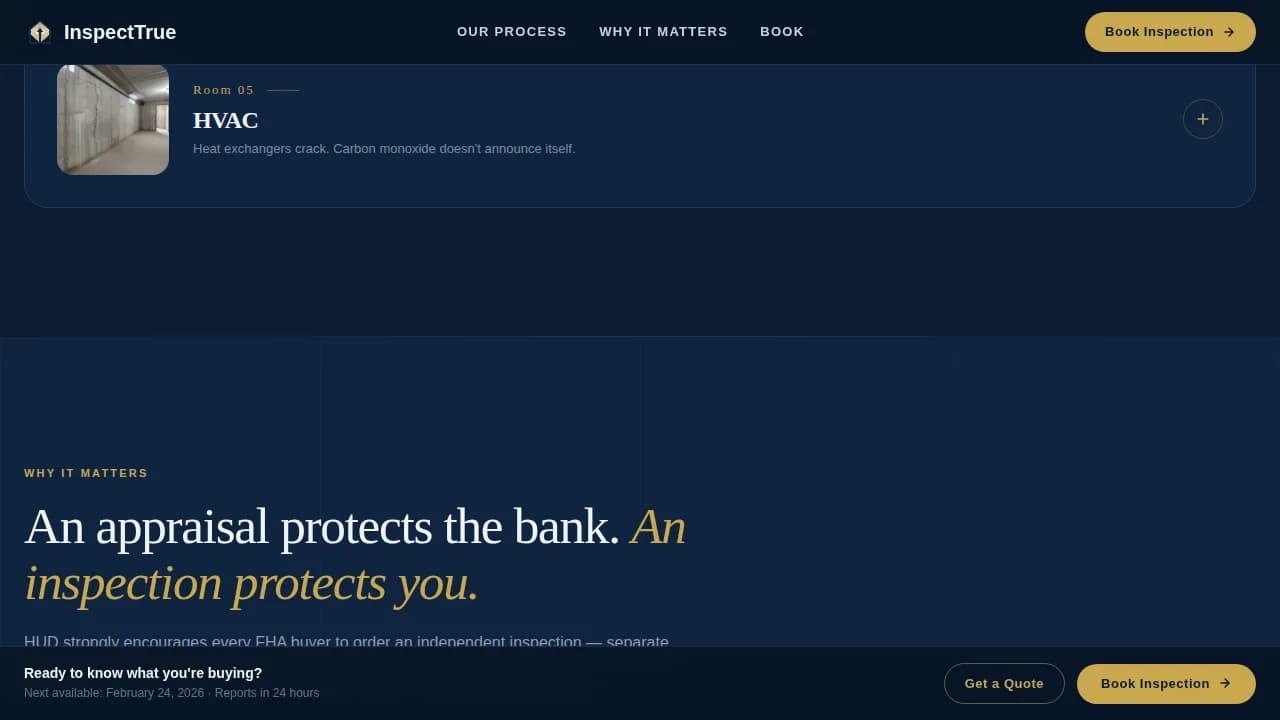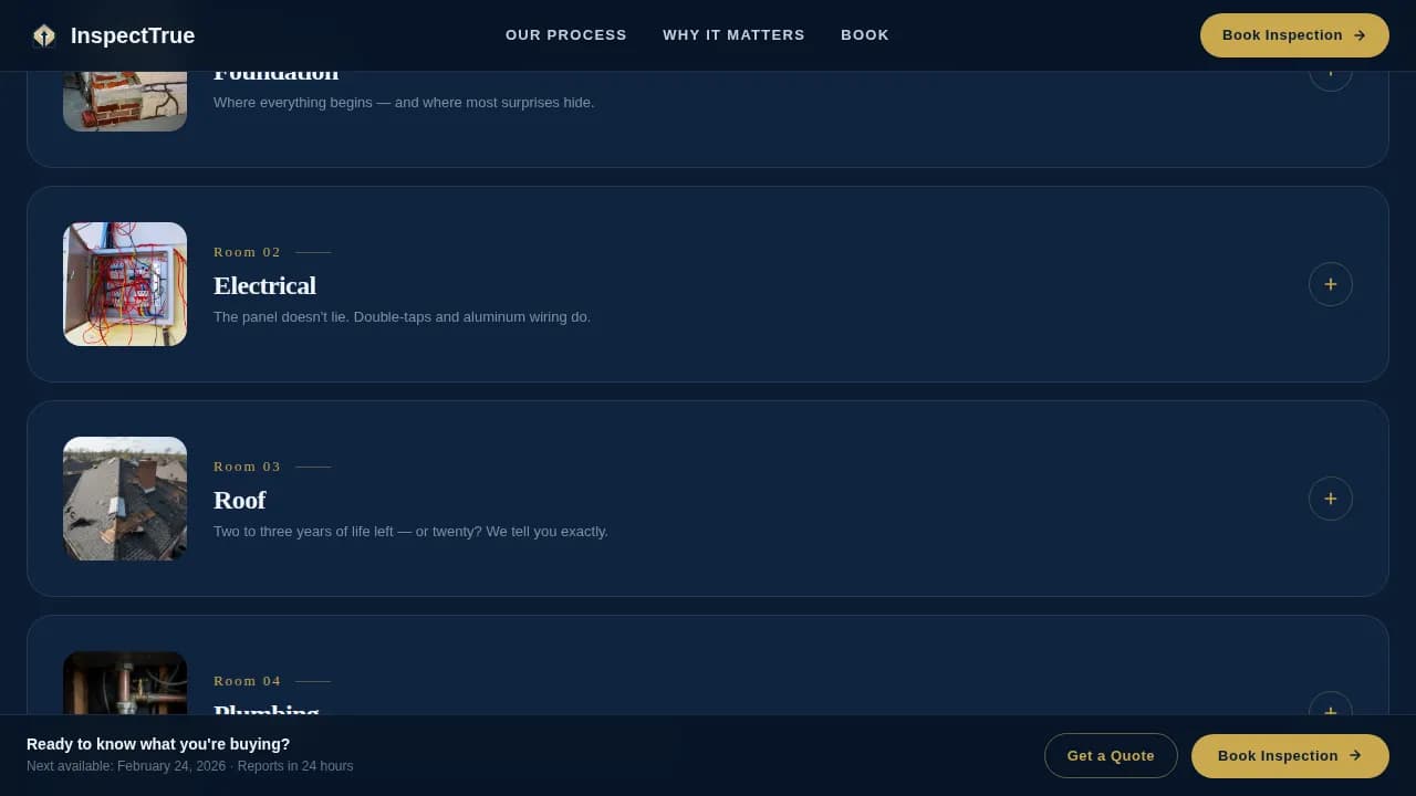 This template earns the booking by showing the work first. By the time a visitor reaches the final call-to-action, they have already walked through five rooms of inspection evidence and read detailed findings. That sequence turns passive visitors into confident, prepared clients.