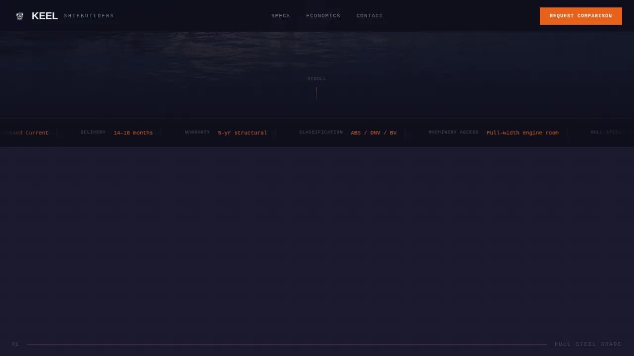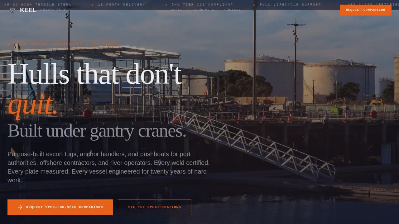 Keel is a shipbuilding landing page built for tugboat and workboat builders targeting port authorities, offshore contractors, and river operators. Its zigzag Comparison/Versus layout sets your specs against industry standards section by section, with scroll-triggered checkmark animations, a cinematic fabrication hall header, and two conversion paths: a spec comparison request form and a gated cost-of-ownership report download.