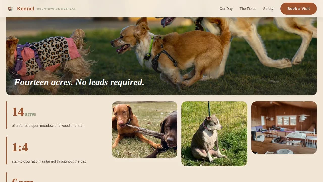 This is a single-page, masonry-style landing page template built for countryside dog boarding and daycare facilities. It uses a day-in-the-life scroll narrative to show dogs living a full, joyful day at the kennel. The design feels earthy and editorial, creating a calm sense of trust before visitors reach the booking form.