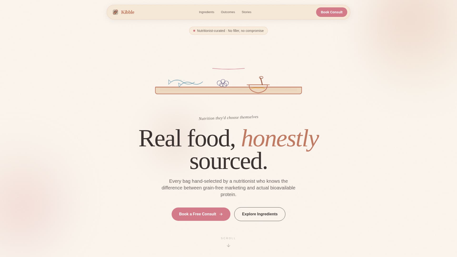 Kibble is a single-page landing page template designed for premium pet food retailers. It opens with a hand-drawn animated illustration, flows through a modular card grid of ingredients and outcomes, and closes the loop with a free nutrition consult booking form and a guided "Build a Bowl" quiz. The warm artisan visual identity makes every section feel honest, crafted, and inviting.