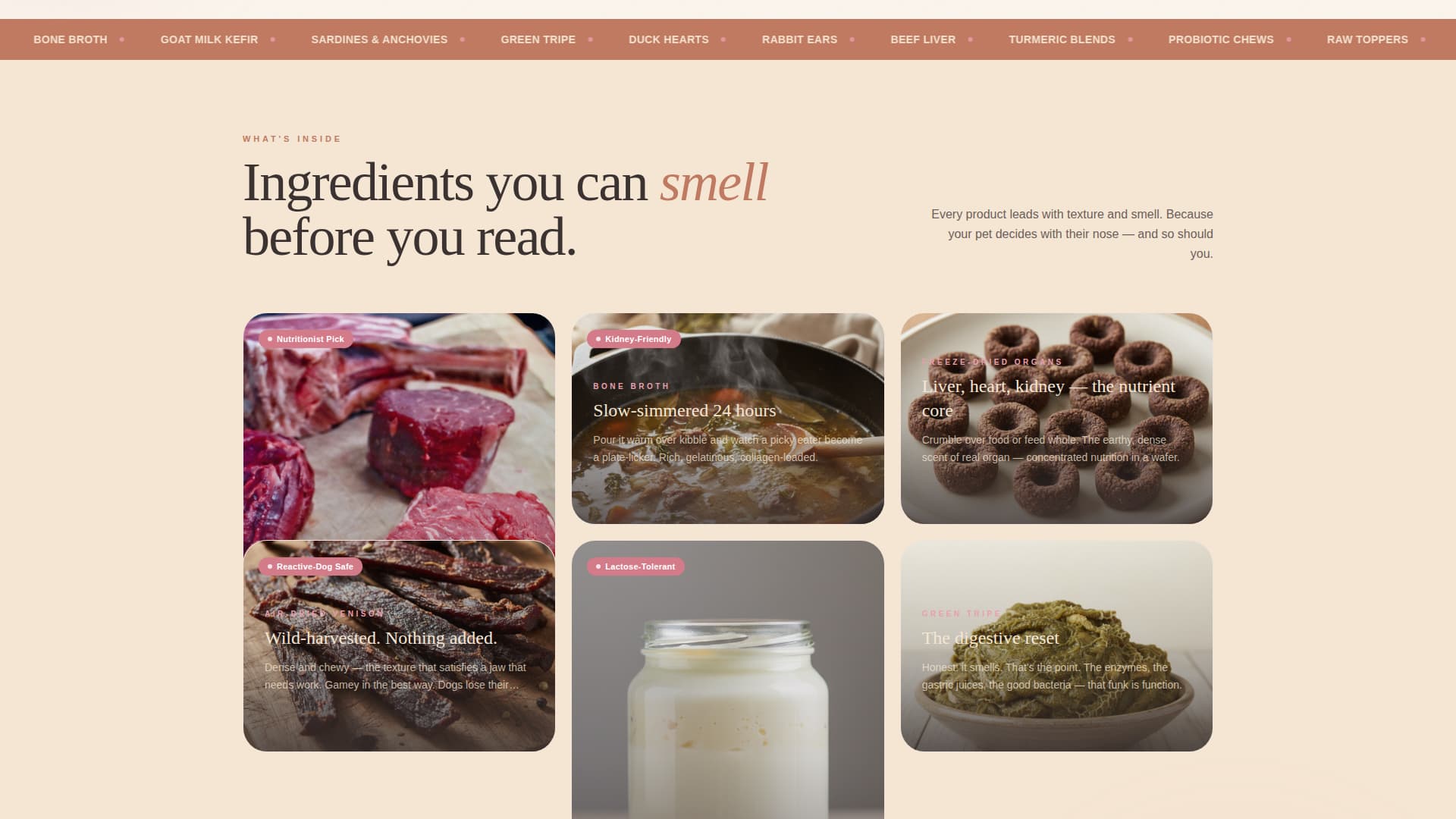 Each modular card leads with texture and aroma before reaching facts. Ingredient cards show glistening muscle fiber and steaming broth imagery. As visitors scroll deeper, the cards pivot from what goes into the food to visible outcomes like glossy coats, calm digestion, and bright eyes.