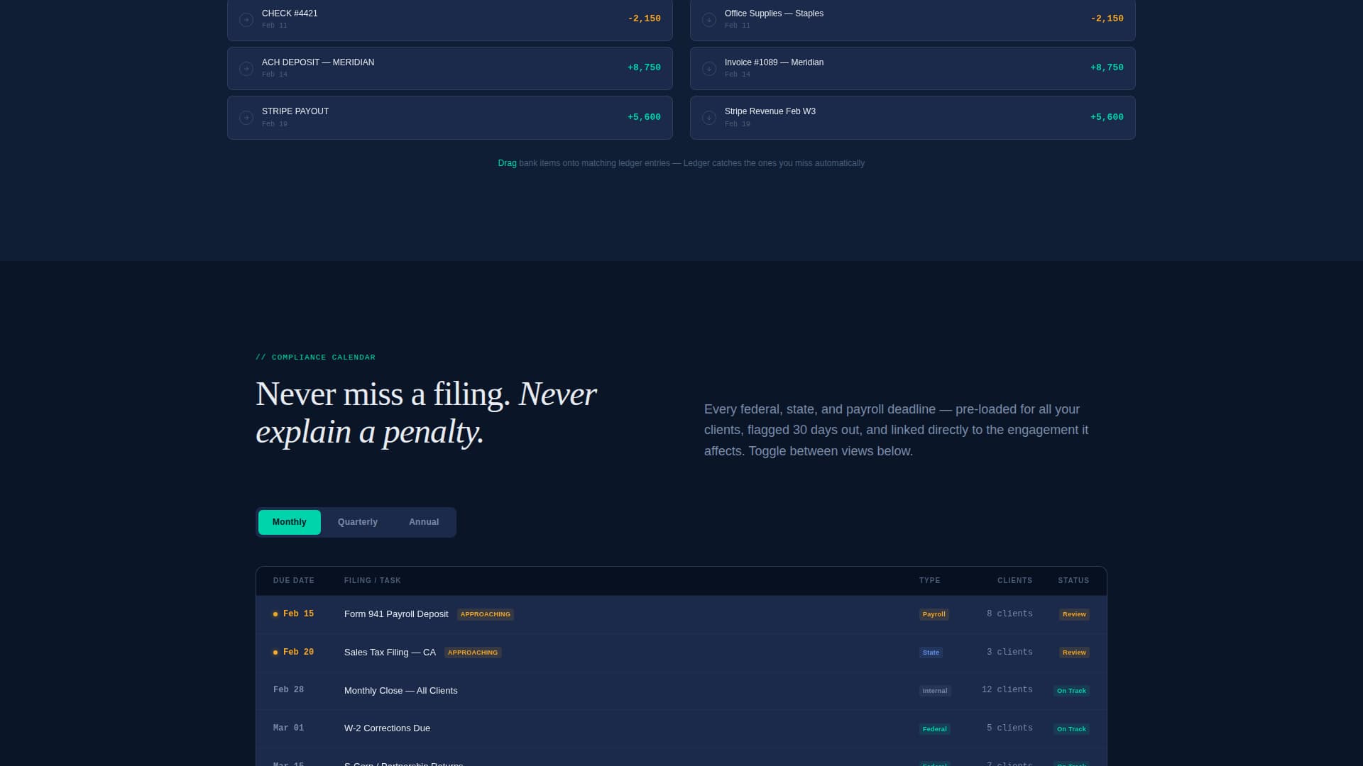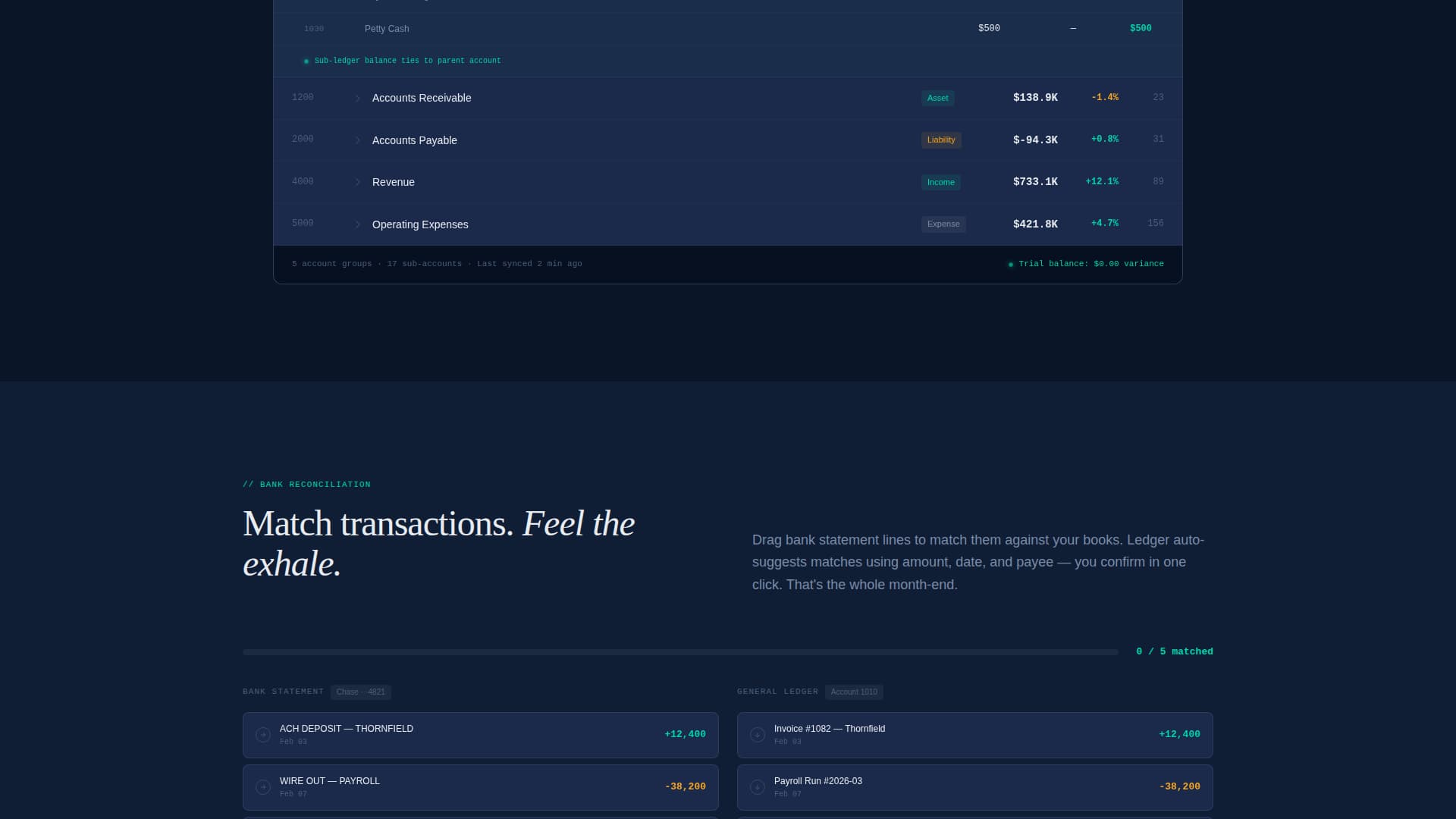 Section three is a mock bank reconciliation module where visitors drag and match transactions themselves. This single interaction builds more trust than any feature paragraph because it creates genuine muscle memory.