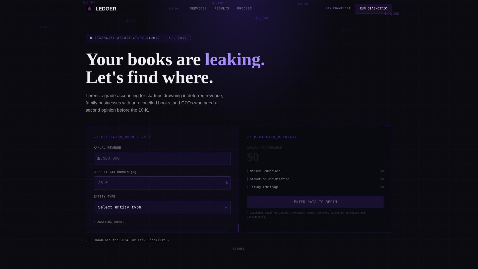 Ledger is a scroll-reveal landing page template built for accounting firms that handle high-stakes financial work. It opens with a live tax savings estimator in the hero, then guides visitors through an animated problem-to-solution sequence. The dark Data Command aesthetic, violet accent palette, and progressive lead capture form make it a sharp fit for firms targeting startup founders, family manufacturers, and mid-market finance leaders.