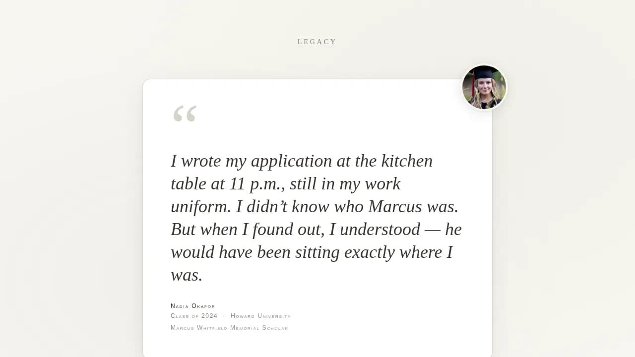 A longer second testimonial uses an asymmetric bento-style layout to build narrative depth. It shows, in detail, how one student's life changed because someone was remembered. This section earns the trust of skeptical applicants and gives donors the evidence they need to feel their contribution will make a real difference.