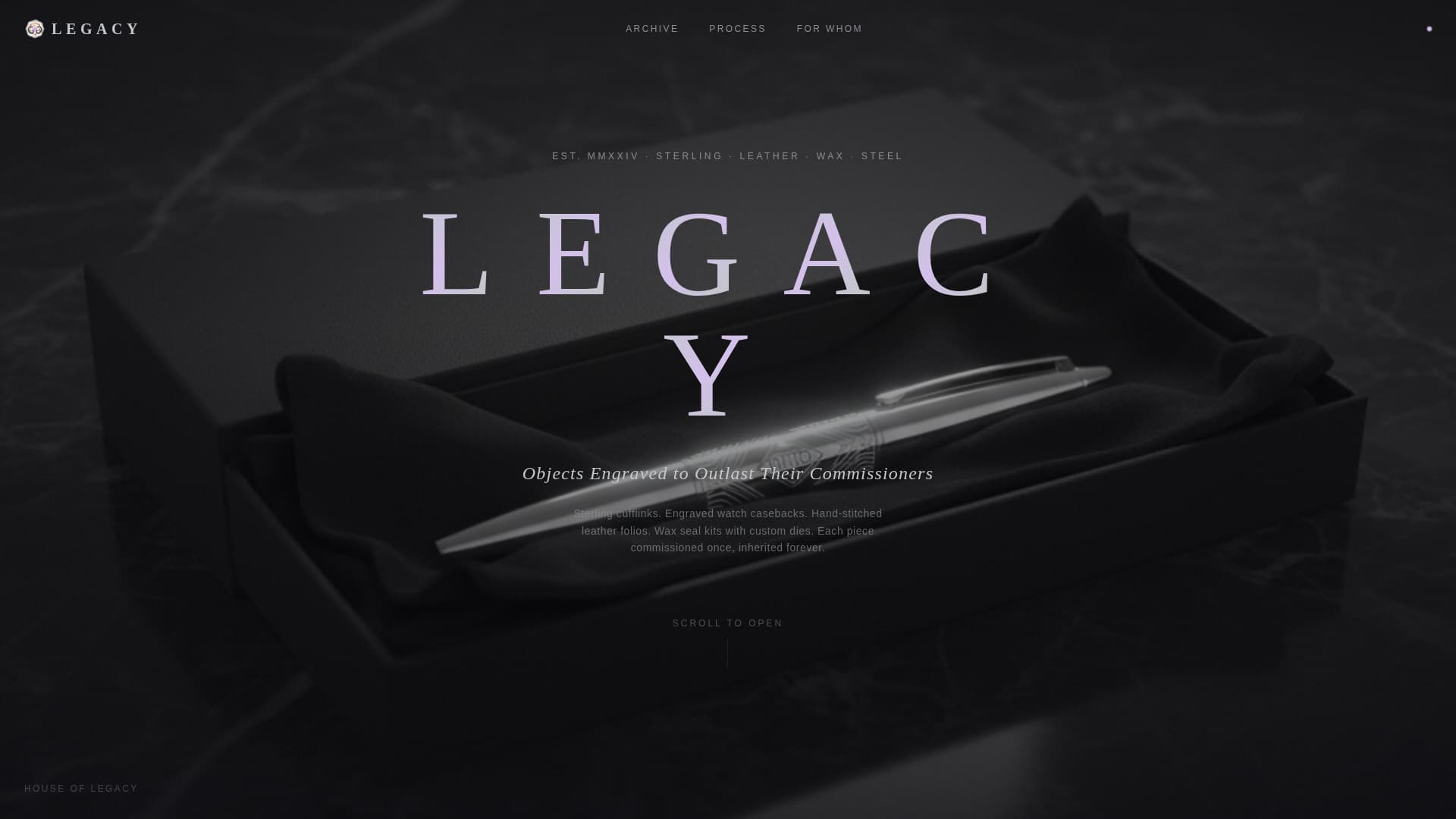 Legacy is a single-page gallery and detail landing page for a brand that engraves family crests, monograms, and heirloom insignias onto objects built to outlast their owners. The Holographic Chrome color system, obsidian backgrounds, and a deliberate unboxing scroll rhythm make the page feel like opening a velvet-lined box in a private study rather than browsing a product catalogue.