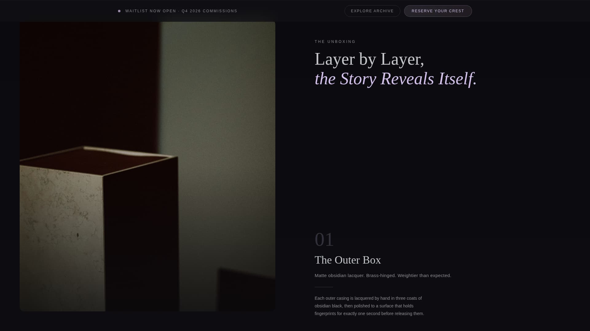 Scrolling literally unwraps the brand layer by layer. Each scroll segment is a gallery frame: first the outer box, then the tissue, then the object, then the engraving detail at macro zoom, then the story behind the crest. The rhythm is slow and ceremonial, built to make the visitor feel the weight of each object.