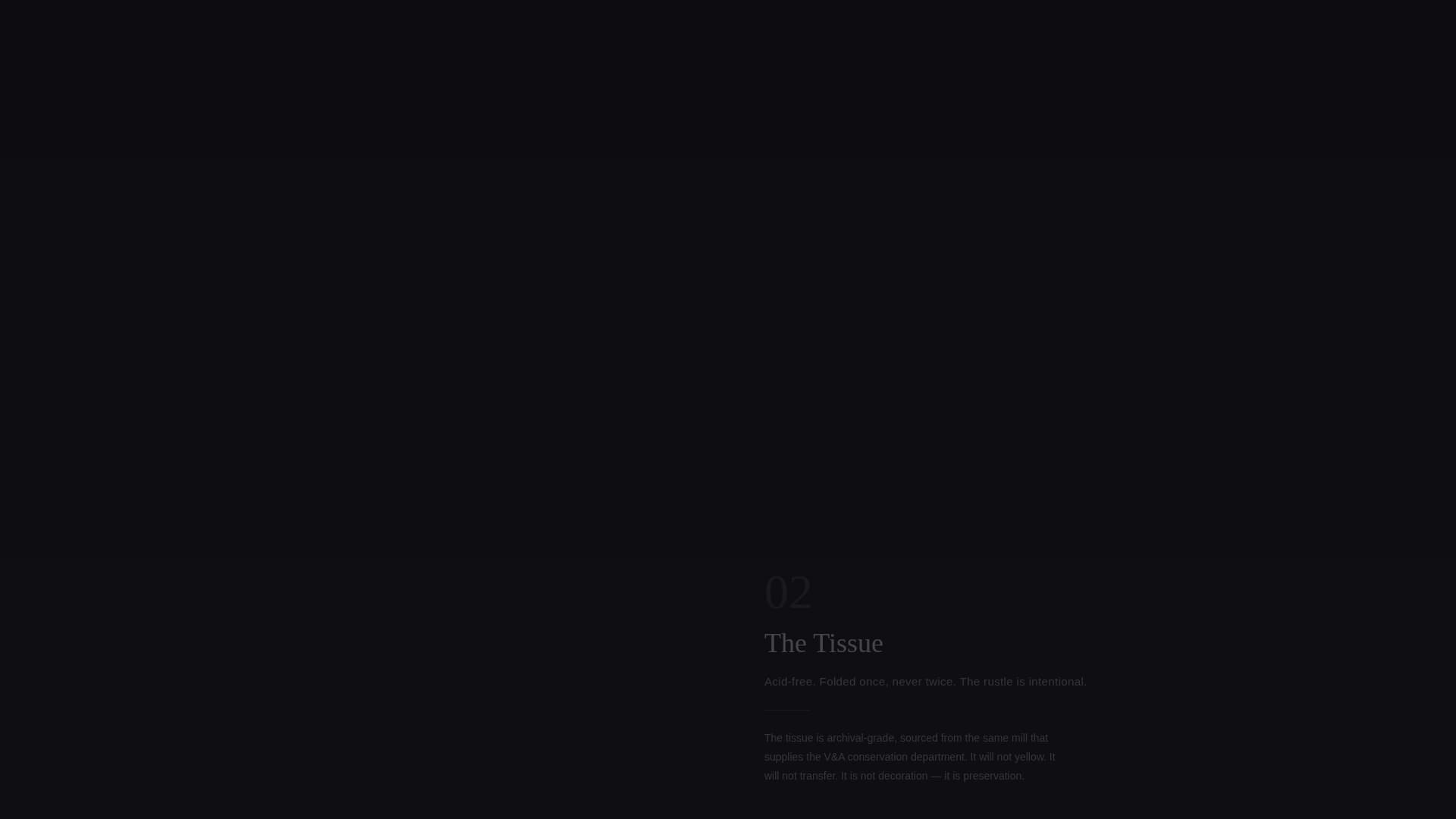 The header opens on an overhead shot of a matte-black presentation box on dark marble, tissue paper barely parted to reveal an engraved object beneath. After a two-second hold, the logotype materializes letter by letter in mercury silver, as if being engraved in real time. No headline crowds the frame on load.