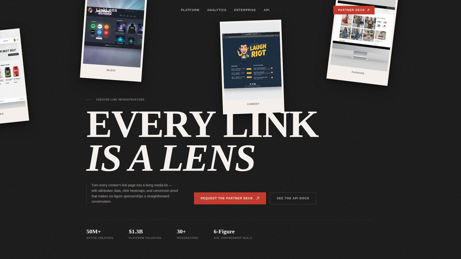 Linklens is a single-page template that transforms a creator's link page into a partnership-ready media kit. Built on an Ink and Paper color system with a Lens and Frame visual identity, it stacks layered creator page mockups that reveal real attribution data on scroll. The goal is simple: by the time a media buyer reaches the form, the business case is already made.