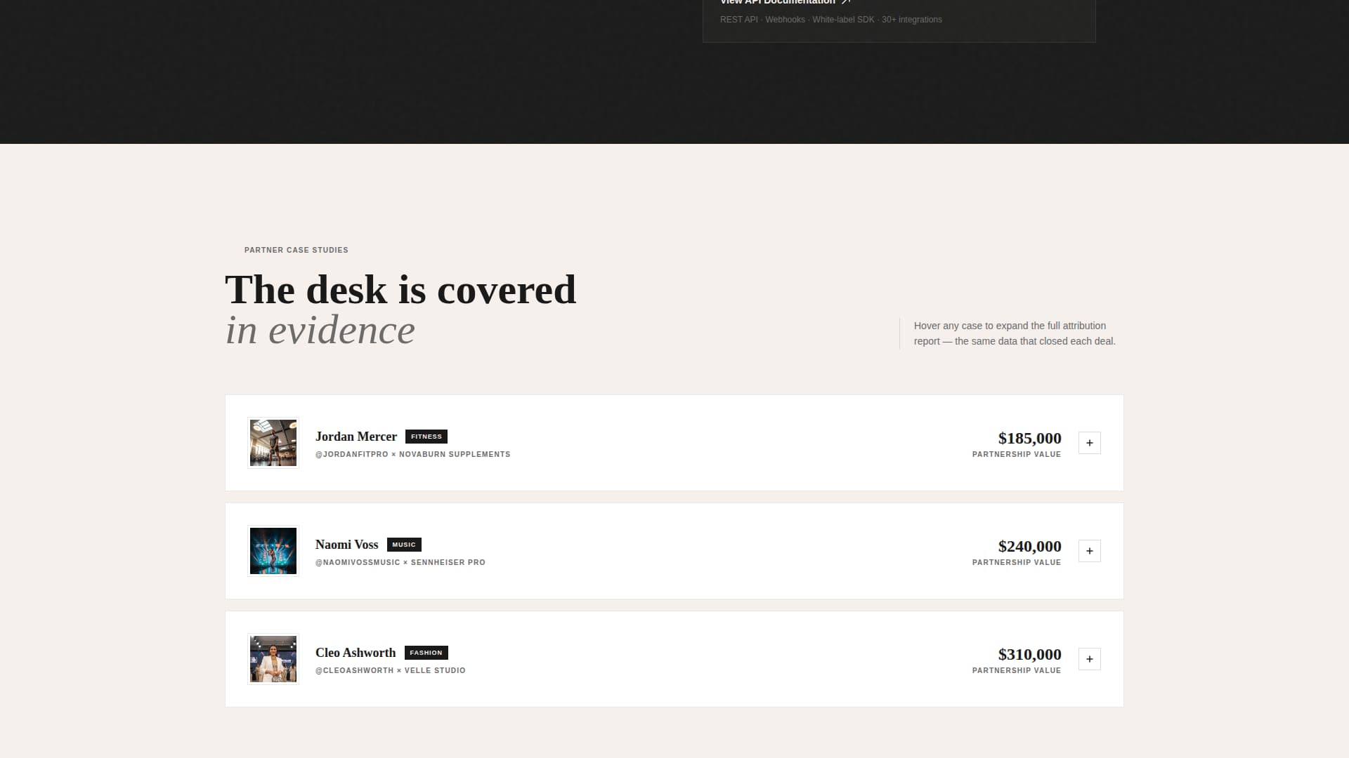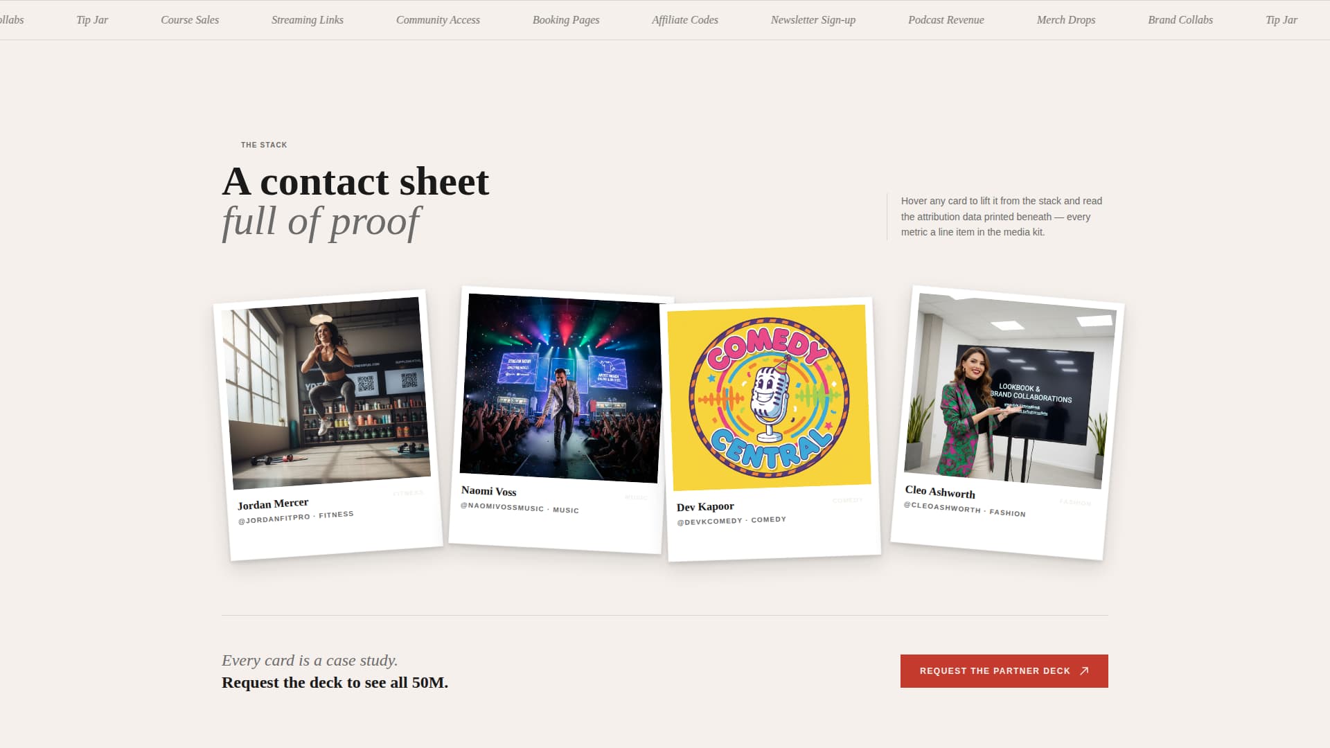 Below the header, a stack of creator page mockups fans out as the visitor scrolls. Each card slides forward to reveal engagement metrics, click-through heatmaps, and conversion data annotated in graphite gray. Hovering any card lifts it above the stack and expands a brand-partnership case study beneath it.