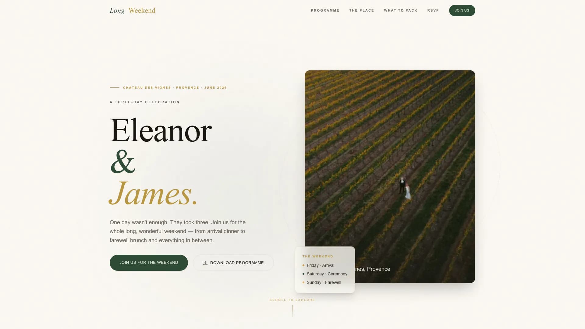 Longweekend is a single-page editorial wedding invitation template designed for multi-day celebrations. It presents three days of events as distinct narrative chapters, guides guests through dress code requirements, venue details, and travel info, and collects attendance and dietary preferences through a structured RSVP form. The result is a wedding website that feels less like a form and more like an invitation to a world.