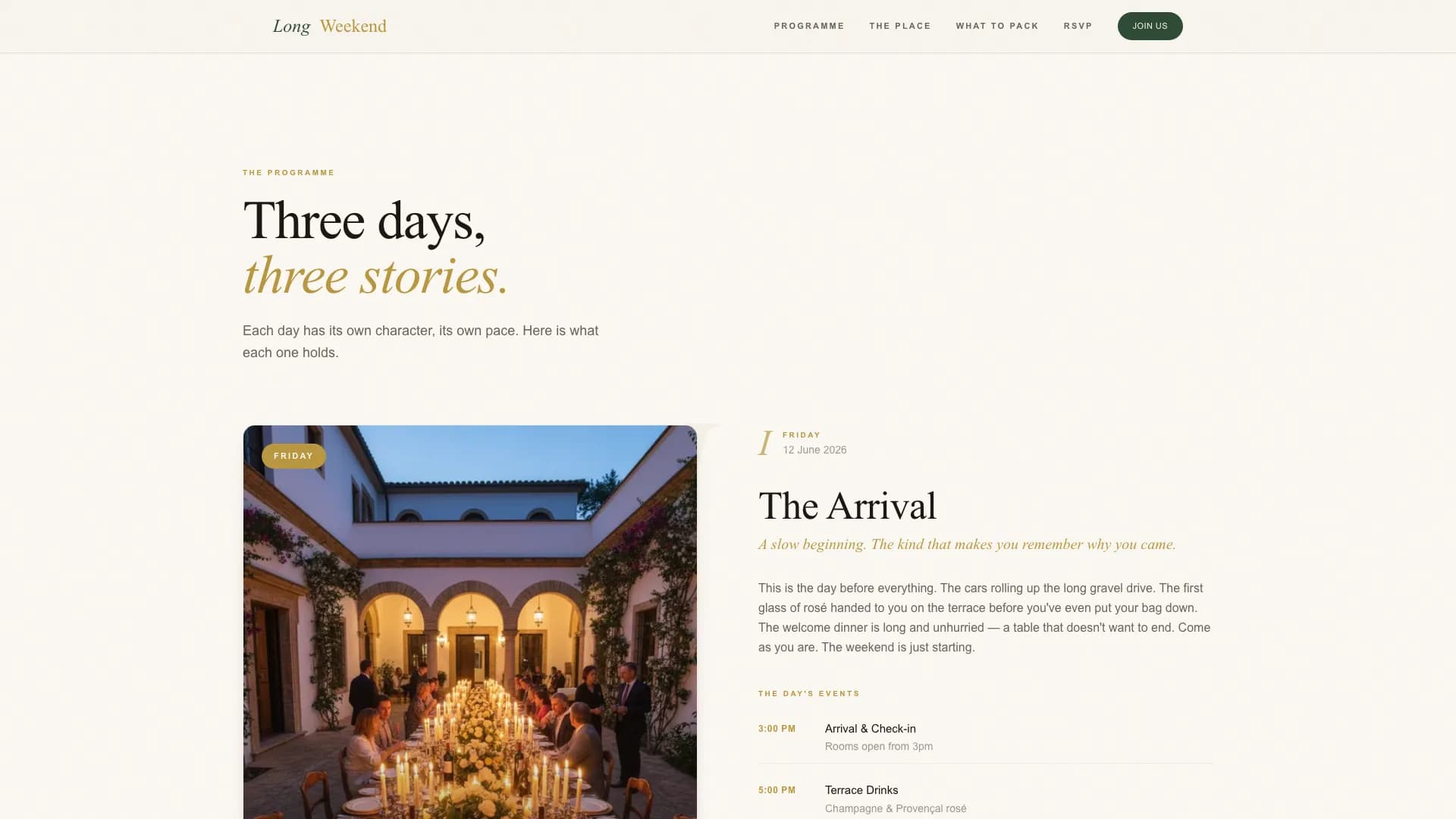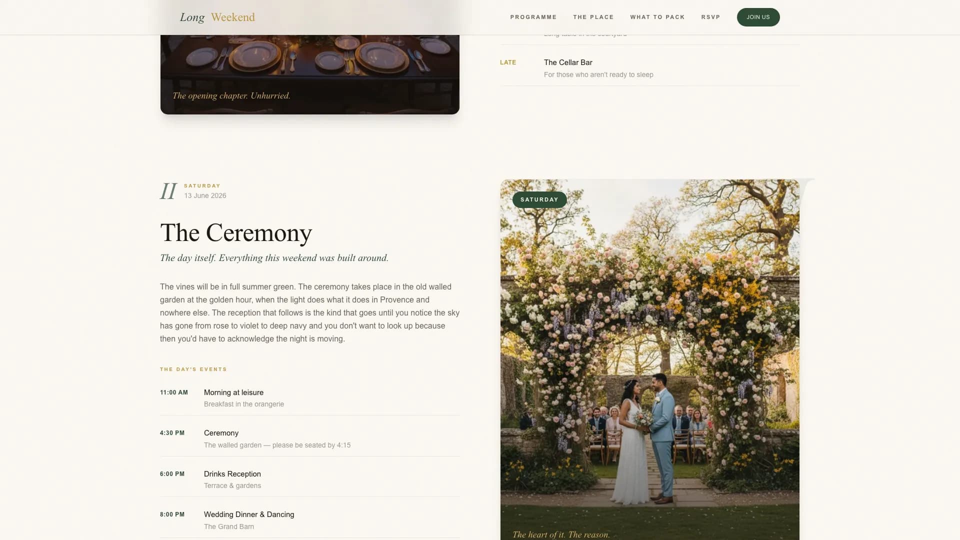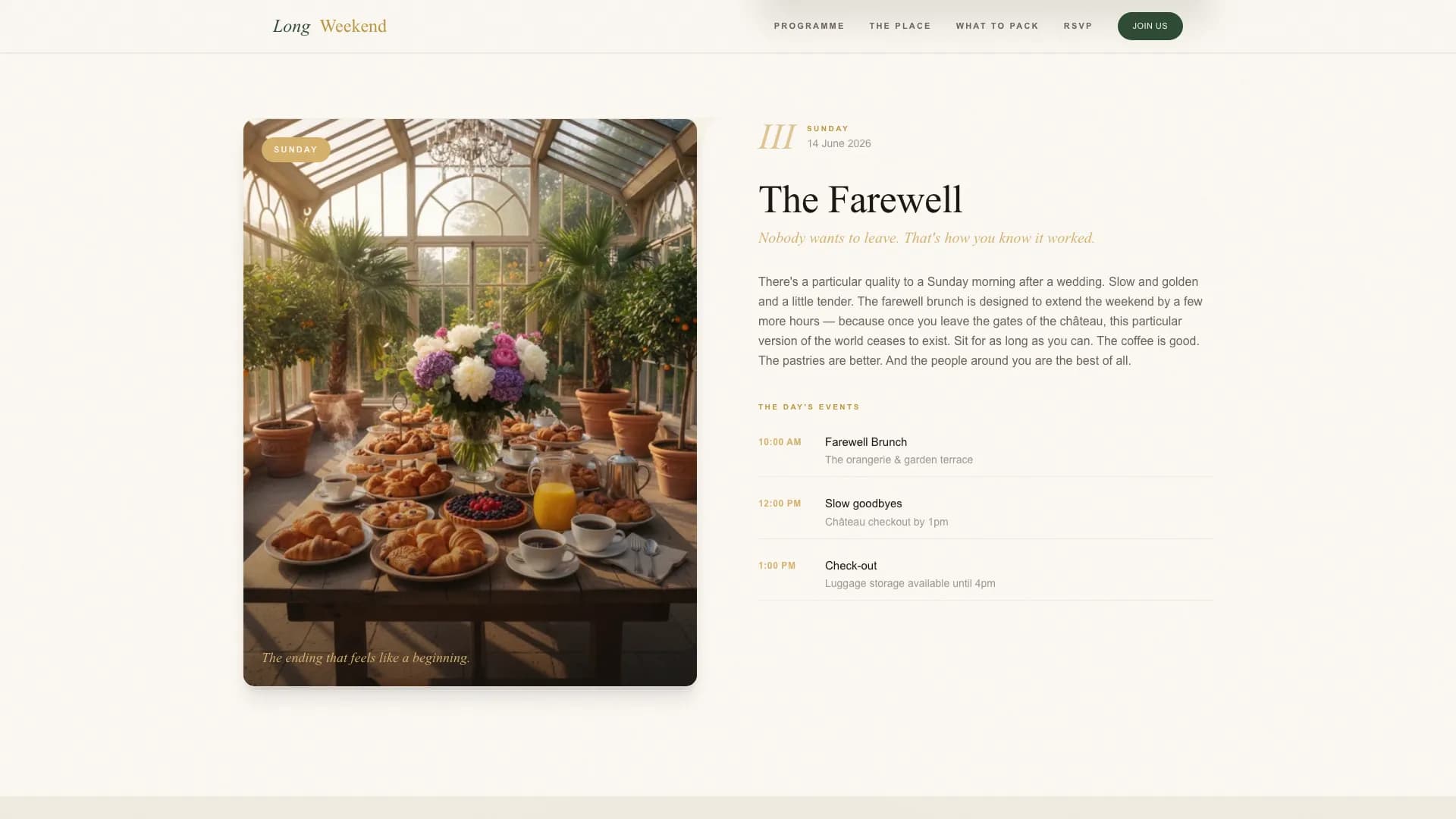 Each of the three days is presented as a separate narrative chapter with a distinct personality and description. Day one covers arrival and the welcome dinner. Day two covers the ceremony and reception, the heart of the wedding day. Day three closes with the farewell brunch. Chapter headings use an elegant editorial serif, and the reveal animation mimics turning the pages of a well-designed supplement. This structure is what makes multi day celebrations readable rather than overwhelming.