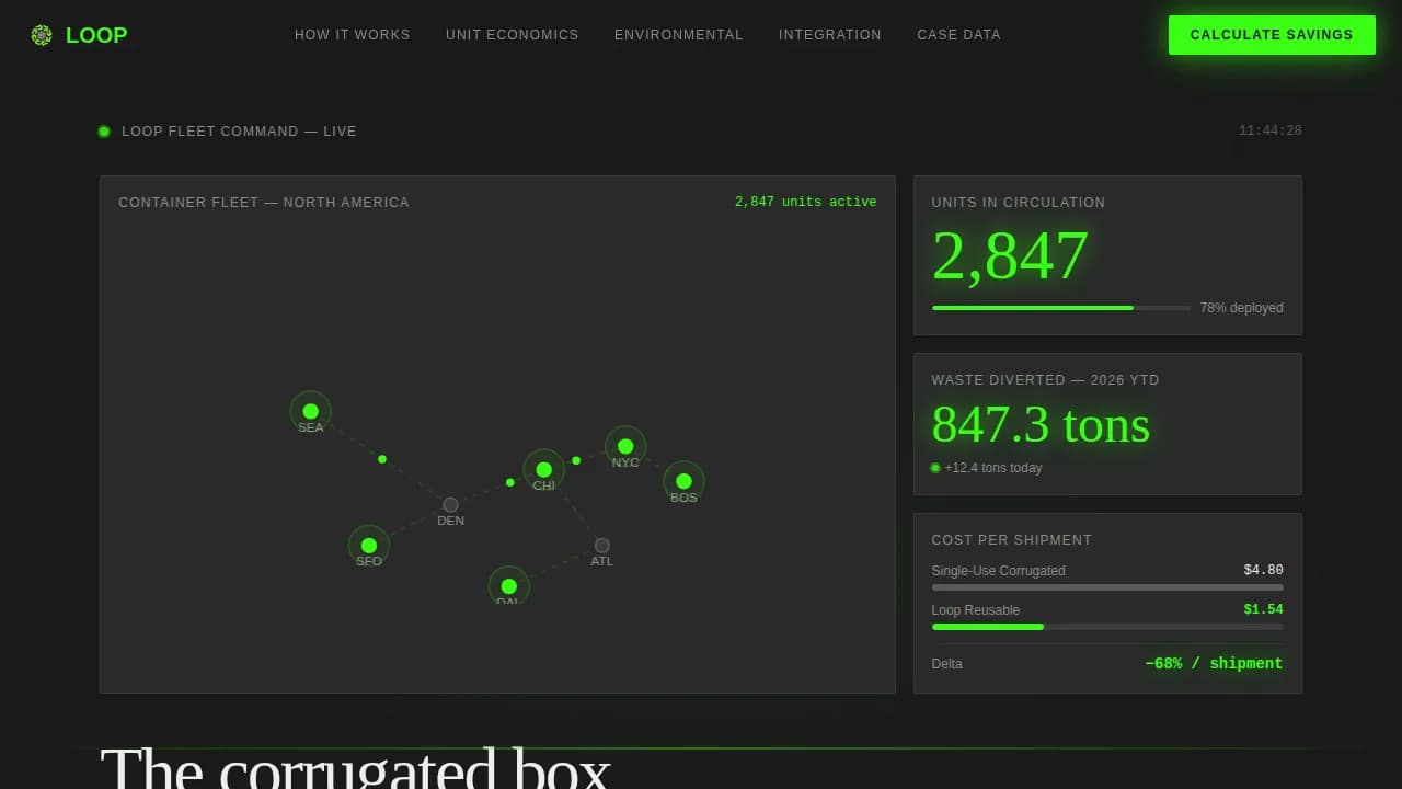 Loop is a hub-and-spoke landing page template built for reusable packaging fleet services. It opens with a live-style dashboard header, then radiates into data-led spoke sections covering how the closed-circuit system works, unit economics, environmental impact, logistics integration, and operator case data. Every section leads with an oversized metric before the explanation follows.