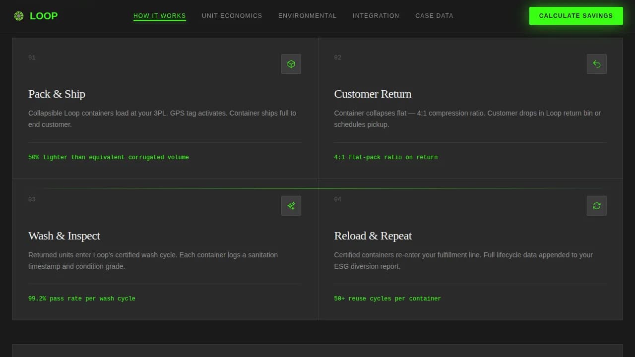 Single-use corrugated packaging creates compounding costs and packaging waste at scale. Logistics teams need a landing page that communicates the full value of a reusable system before they will click through to a calculator or sales conversation.
