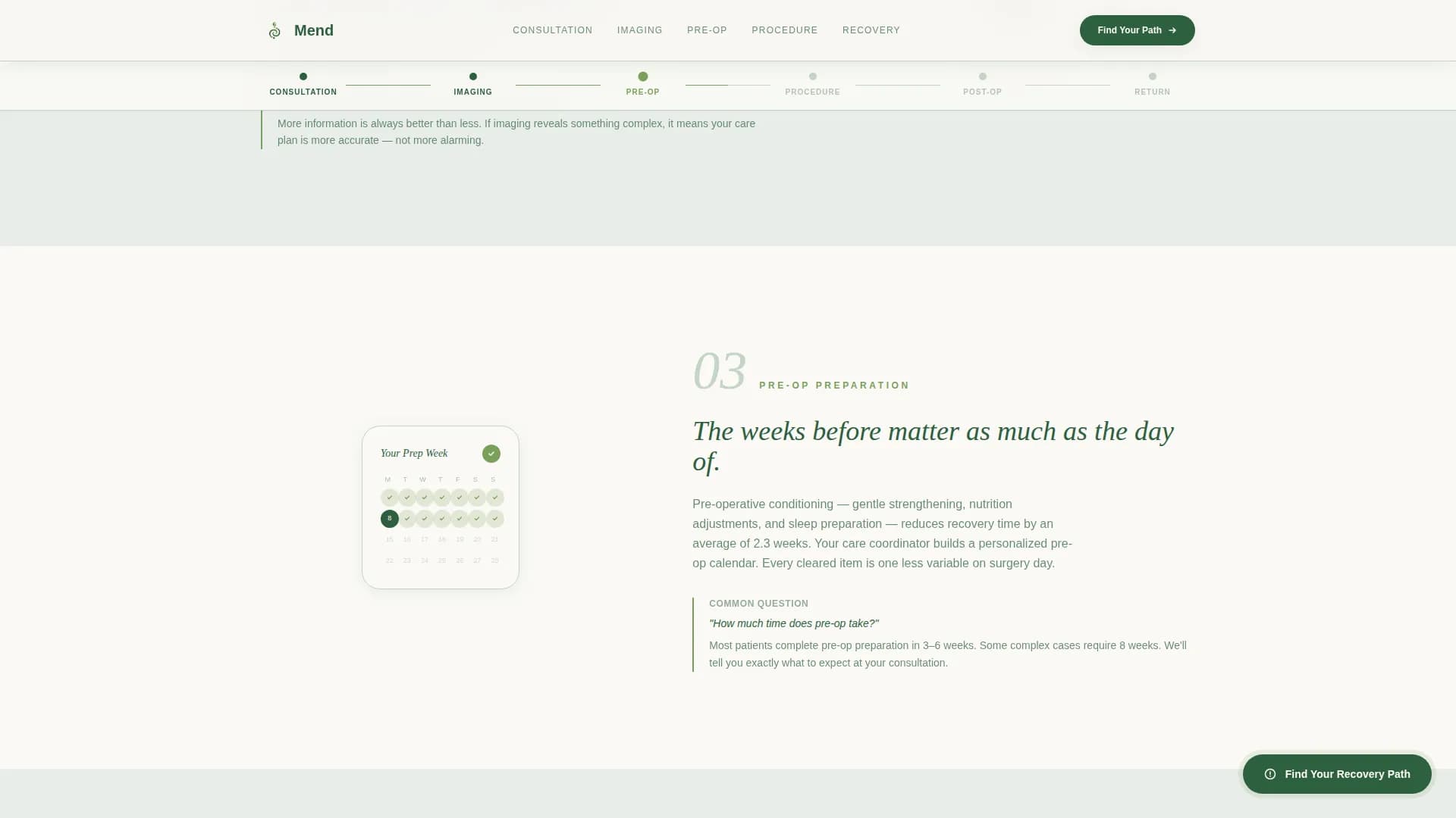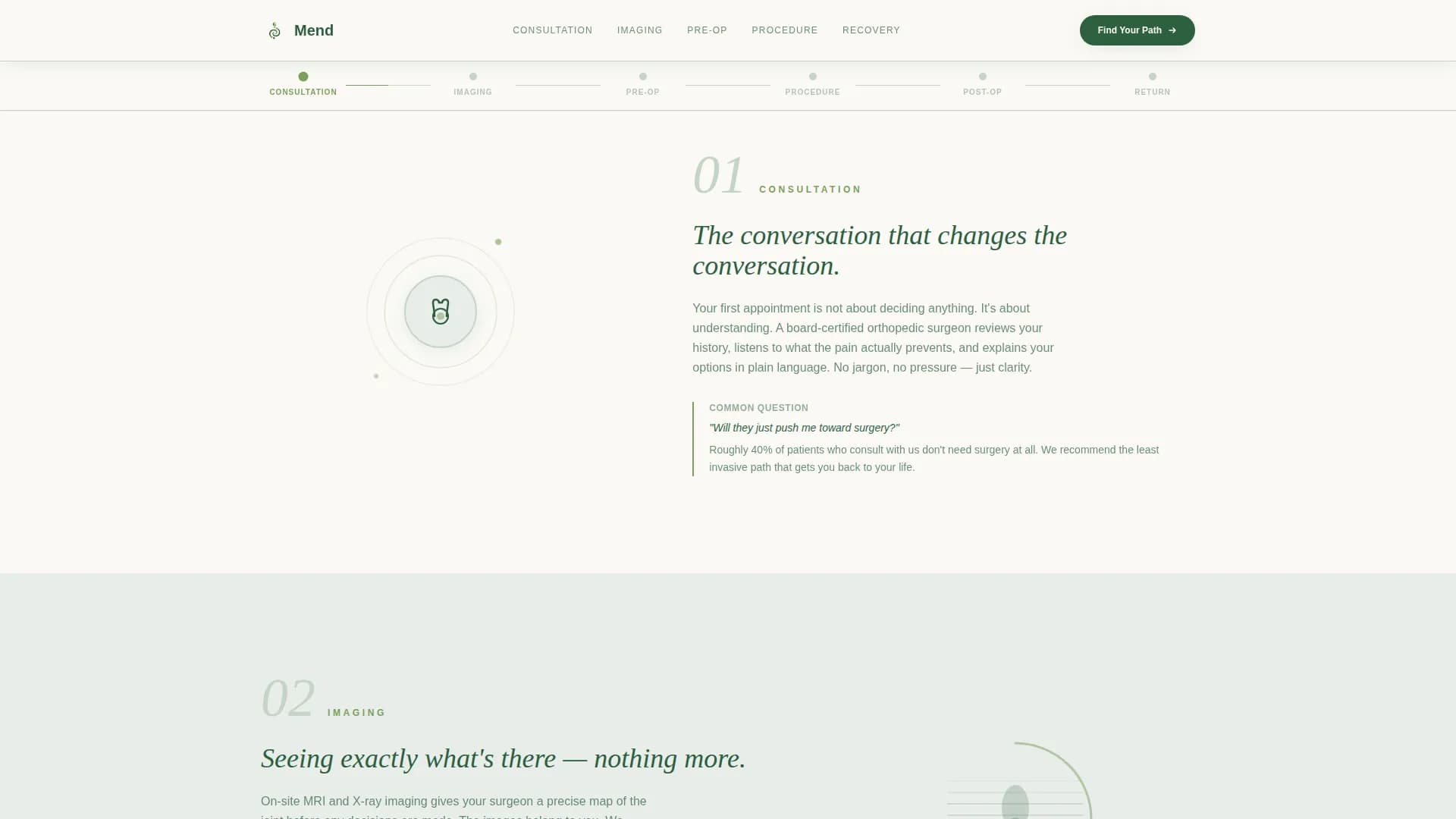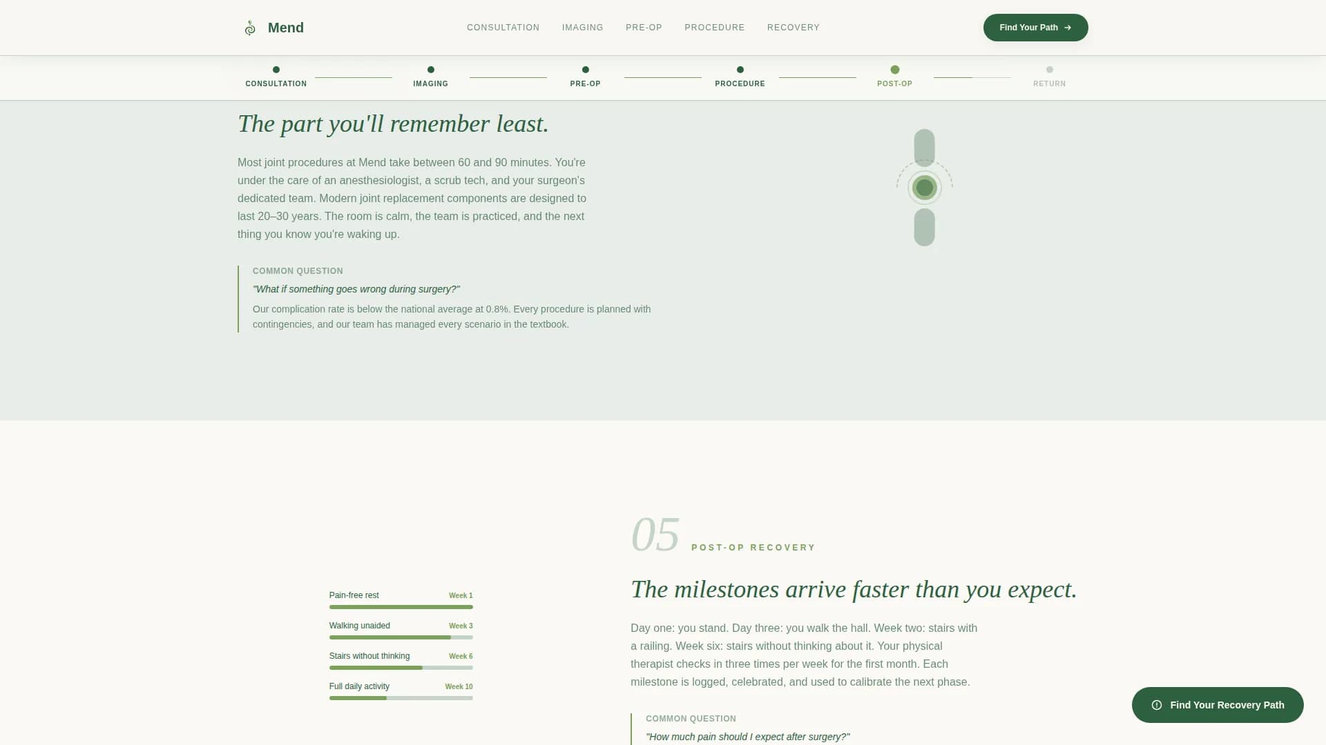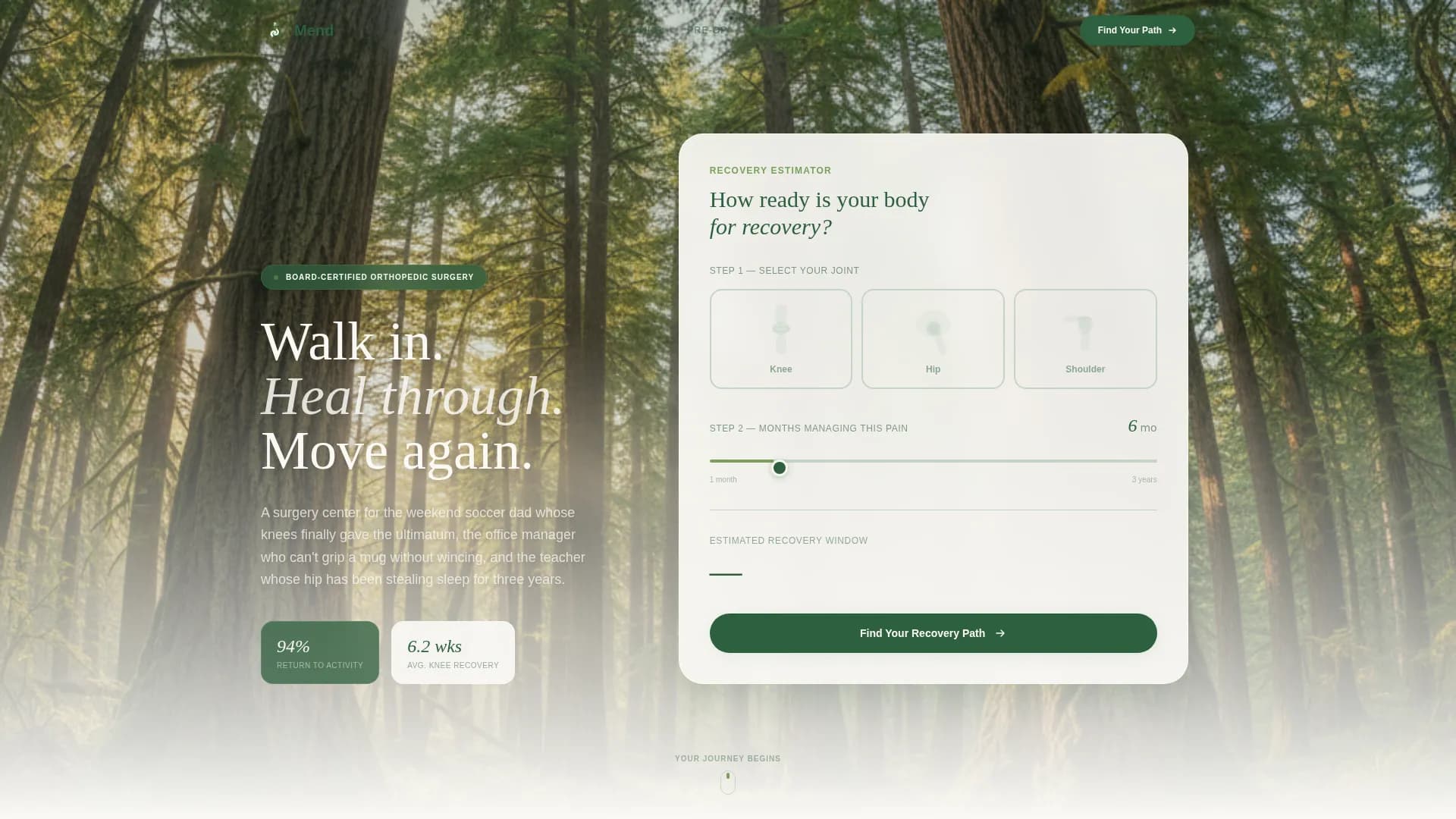 Mend is a hub-and-spoke orthopedic surgery center landing page built around a recovery estimator, a six-phase surgical journey timeline, and a seven-question progressive assessment. It guides pain-affected adults from first click to consultation booking with low friction. The Forest Trust color system and step-by-step structure turn surgical anxiety into quiet confidence before a patient ever walks through the door.