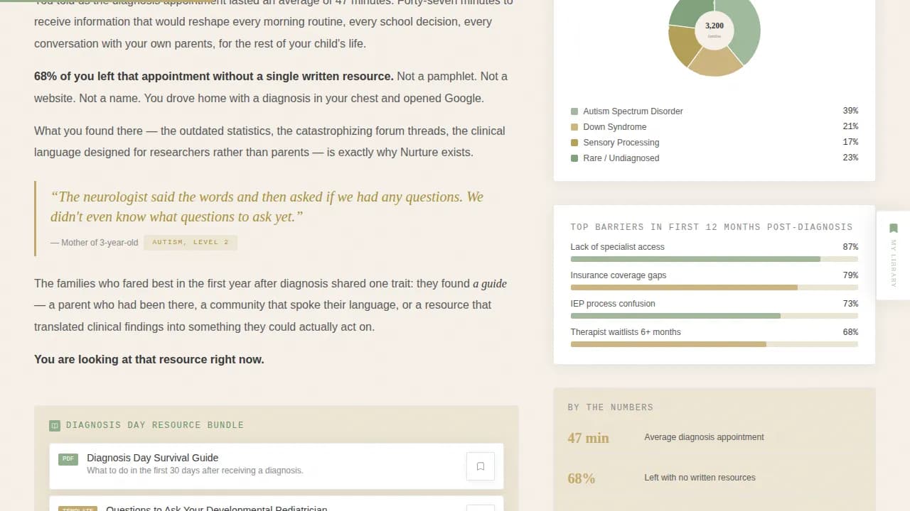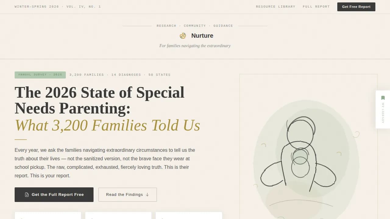 The Nurture landing page template is a warm, editorial resource hub built for special needs parenting blogs. It pairs a broadsheet-inspired 60/40 asymmetric grid with a Japanese Zen color palette to present research-backed guidance, original survey data, downloadable resource bundles, and a gentle email-capture flow that earns trust before asking for anything in return.