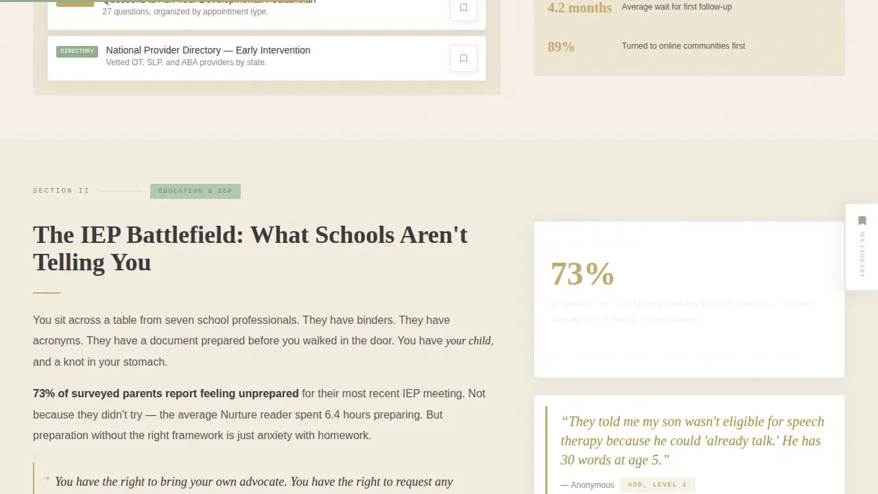 The Nurture template is designed desktop-first, reflecting the real behavior of its audience: parents researching at night on laptops, caregivers reviewing IEP resources between meetings, and grandparents reading quietly at a kitchen table. A mobile fallback ensures the experience remains accessible and readable on smaller screens.