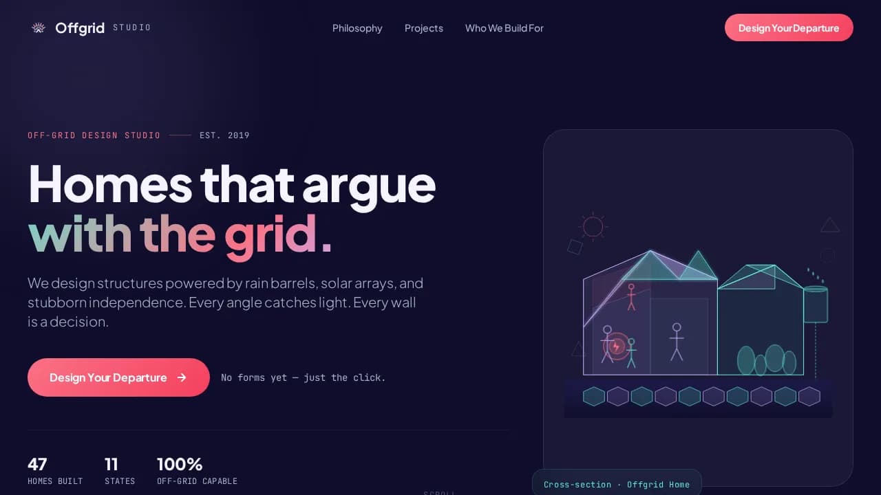 Offgrid is a click-through landing page template for off-grid home design studios. It opens with an origin story, builds wonder through rotating project showcases, and closes with one decisive call to action. The asymmetric grid designs feel like a sketchbook meeting a geodesic dome, making departure feel like invention rather than sacrifice.