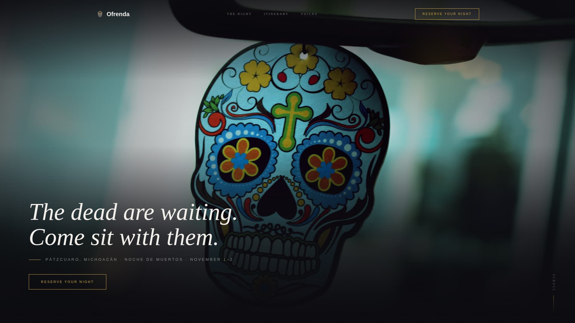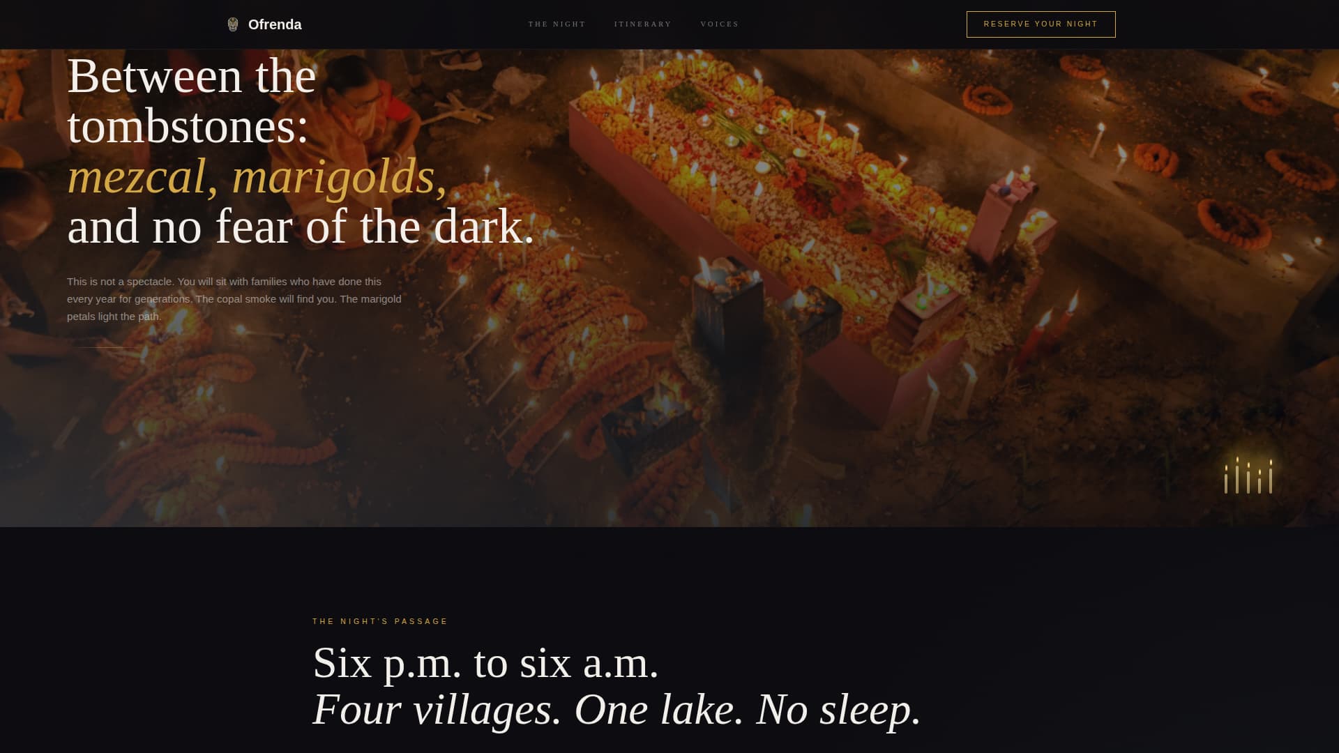 Ofrenda is a single-page booking experience for a guided Noche de Muertos tour through Michoacán's candlelit cemeteries. The template pairs a cinematic hero video loop with a scroll-driven atmospheric descent, a stepped reservation flow, and scarcity mechanics. Every design choice reinforces how rare and unrepeatable this particular night is.