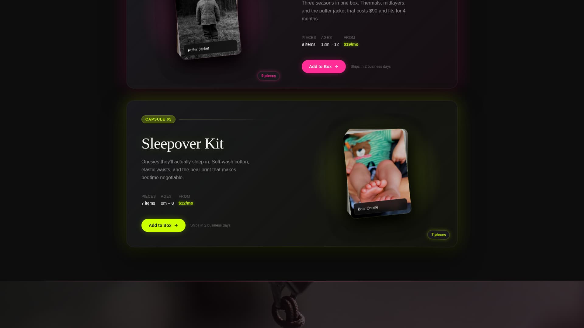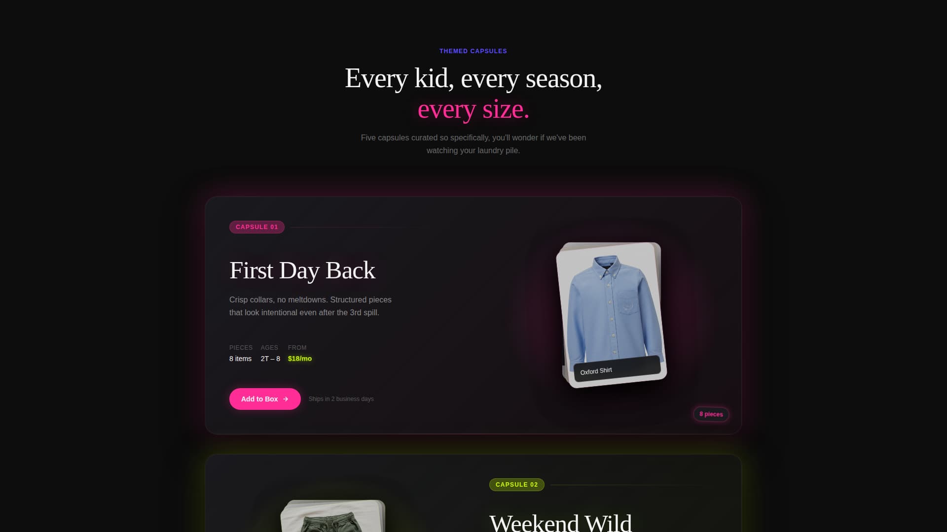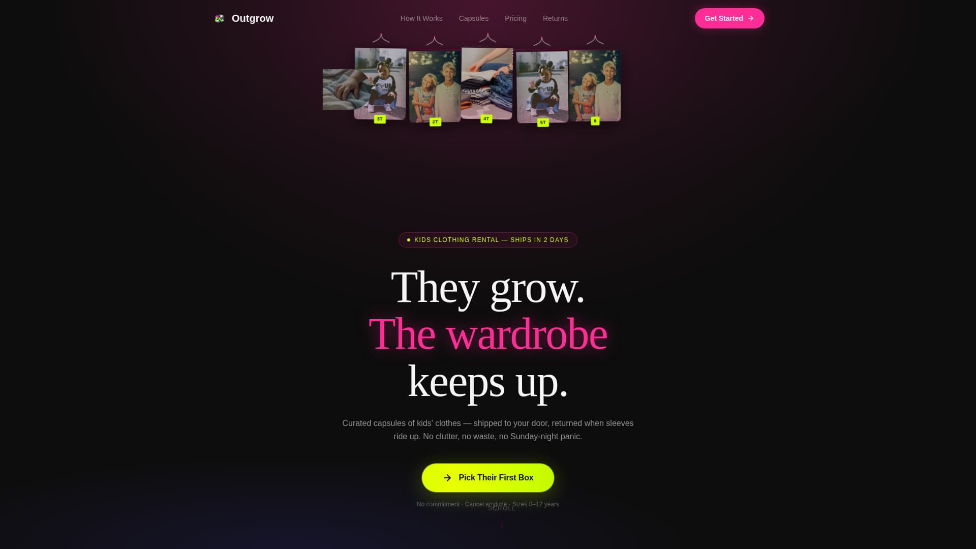 Outgrow is a dark-immersive landing page template built for kids clothing rental services. It uses a neon-on-blackout visual system, layered capsule collection cards, and a single click-through conversion path. Parents browse five themed wardrobe capsules, read real social proof, and tap one call to action to reach a plan picker, no forms, no friction.