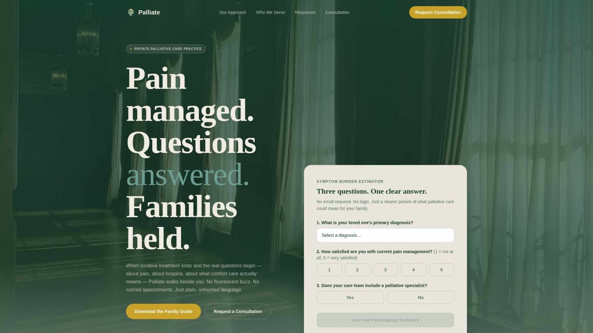 A calm, three-question interactive tool sits in the hero section. Visitors select their loved one's primary diagnosis, rate current pain management satisfaction on a one-to-five scale, and confirm whether a palliative specialist is already on the care team. The tool returns a personalized summary statement with a single outcome number rendered large in amber, requiring no login and no email address.