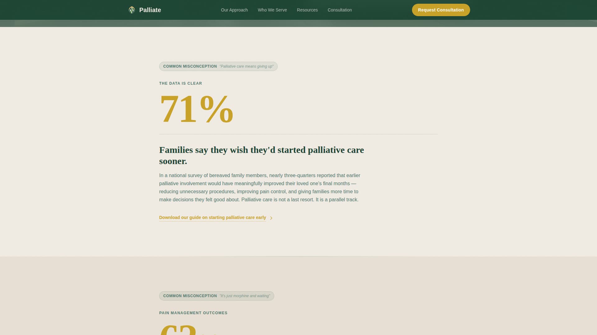 Four amber statistics appear in oversized type as each scroll section opens, before any explanatory copy follows. Each statistic dismantles one specific misconception, such as when families typically wish they had started palliative care, or how quickly comfort scores improve after consultation. The rhythm is consistent: statistic, contextual paragraph, downloadable resource.