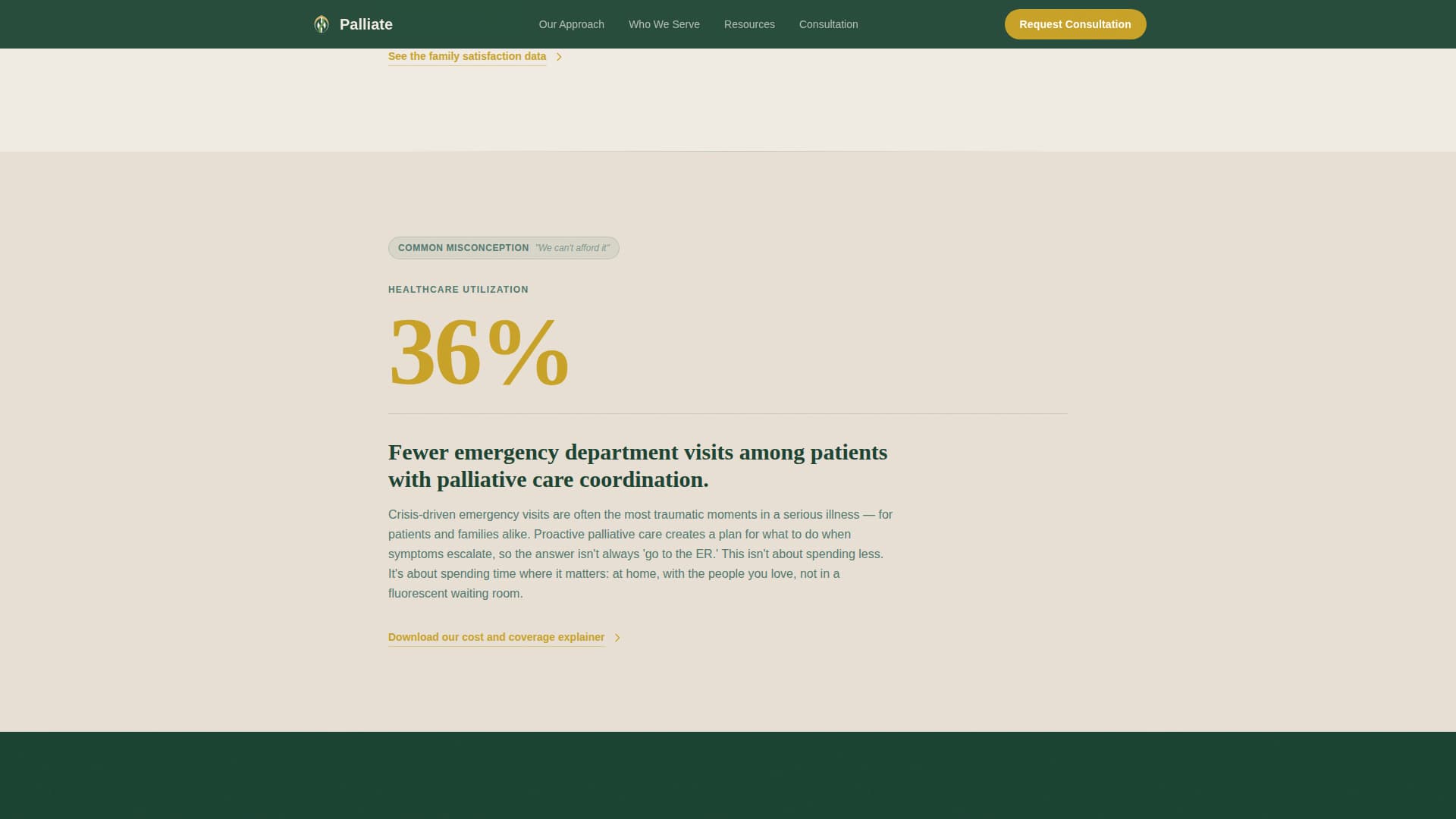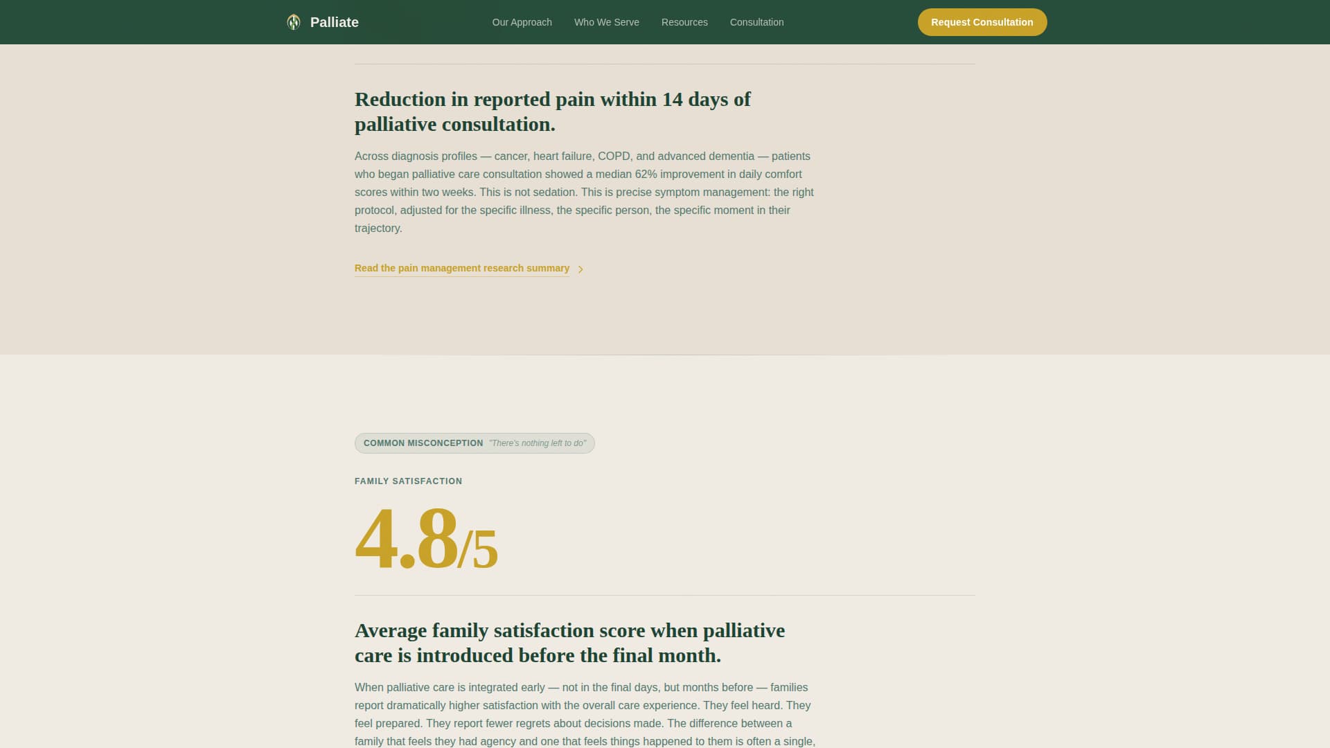 | Stats-First Evidence | Four scroll-triggered amber statistics dismantle common palliative care misconceptions |