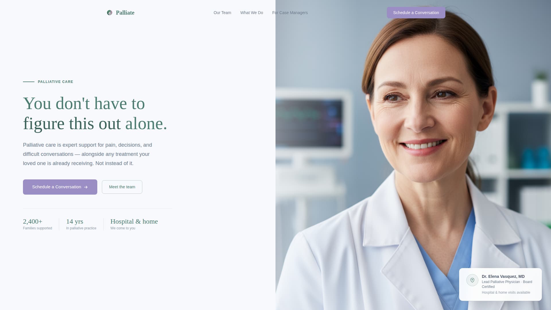 The hero opens with a 50/50 split: a warmly lit physician portrait on the right and a pine-green headline on the left. The single subheadline in stone gray clarifies that palliative care works alongside treatment, not instead of it. A lilac "Schedule a Conversation" button appears immediately below.