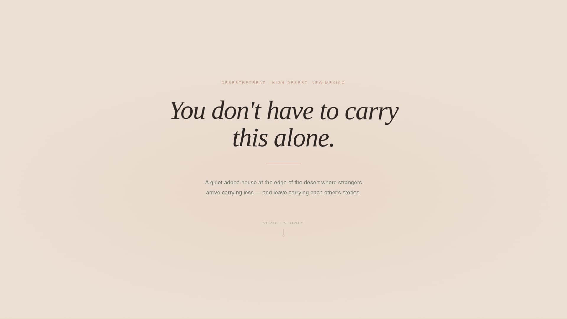 The hero section centers a single italic Fraunces headline on a sand-colored field with generous breathing room. A thin terracotta rule animates slowly beneath it, drawing itself across the screen like a horizon line. No competing imagery or navigation appears at scroll-zero, keeping the emotional entrance undisturbed.