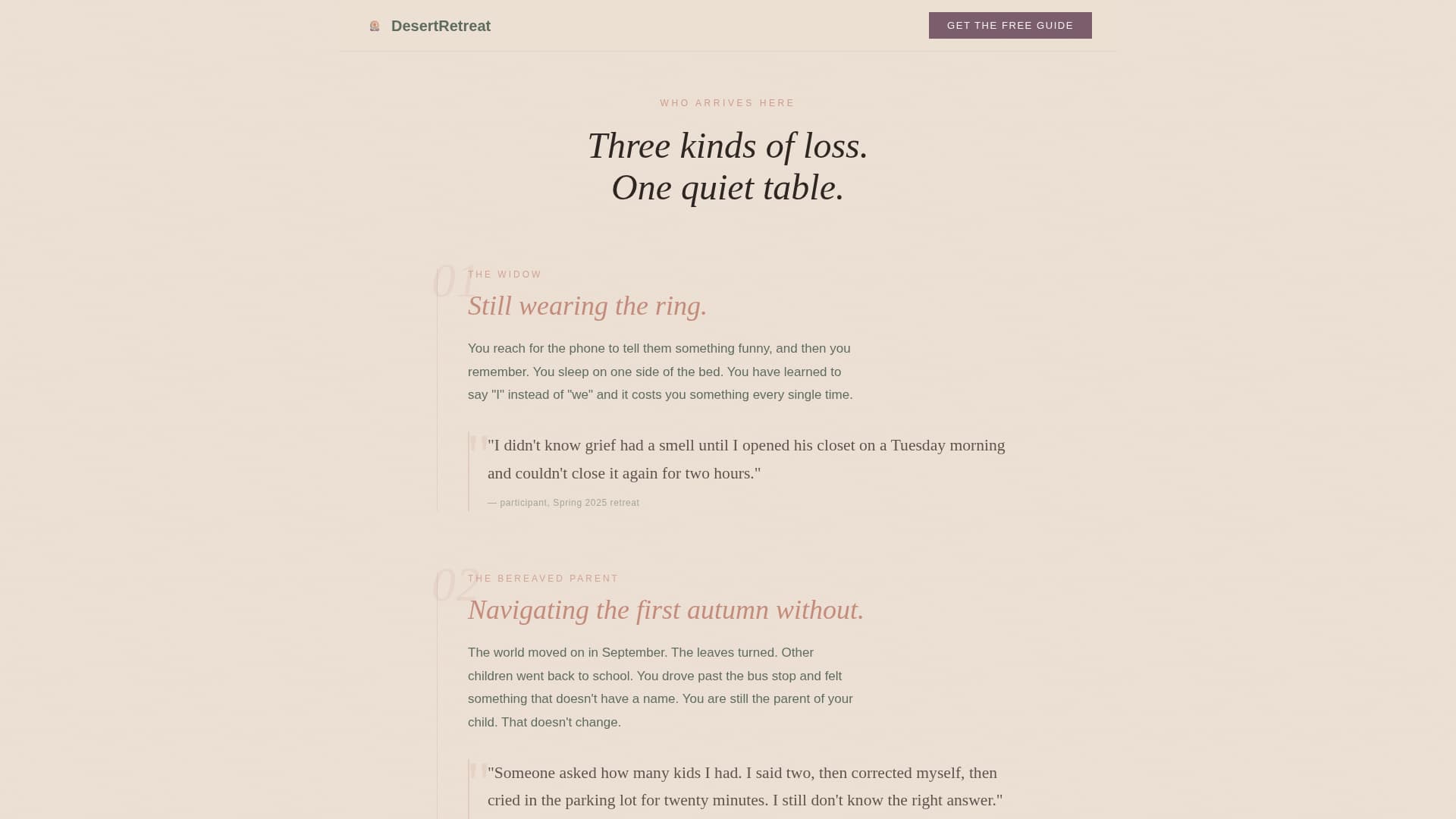 The "Who Arrives Here" section presents three specific grief portraits with pull quotes and no imagery. This text-only approach keeps the emotional weight in the words and avoids visual distraction at a moment when recognition matters most.