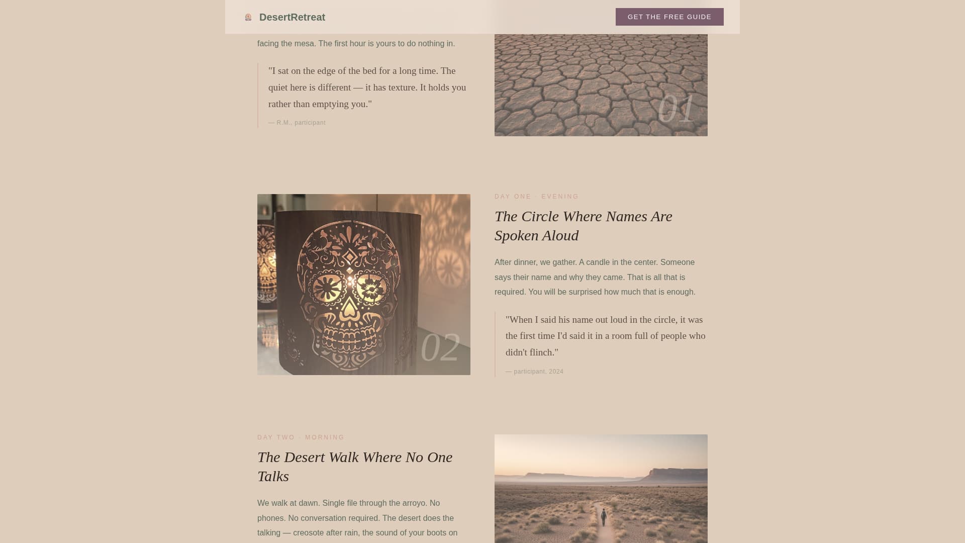 A five-stage scroll-linked timeline walks the visitor through the arc of a retreat: arrival, the opening circle, the silent desert walk, the shared meal, and the final morning. Each stage deepens emotionally and supports inline journal excerpts rendered in Caveat handwriting style alongside quiet landscape photography.