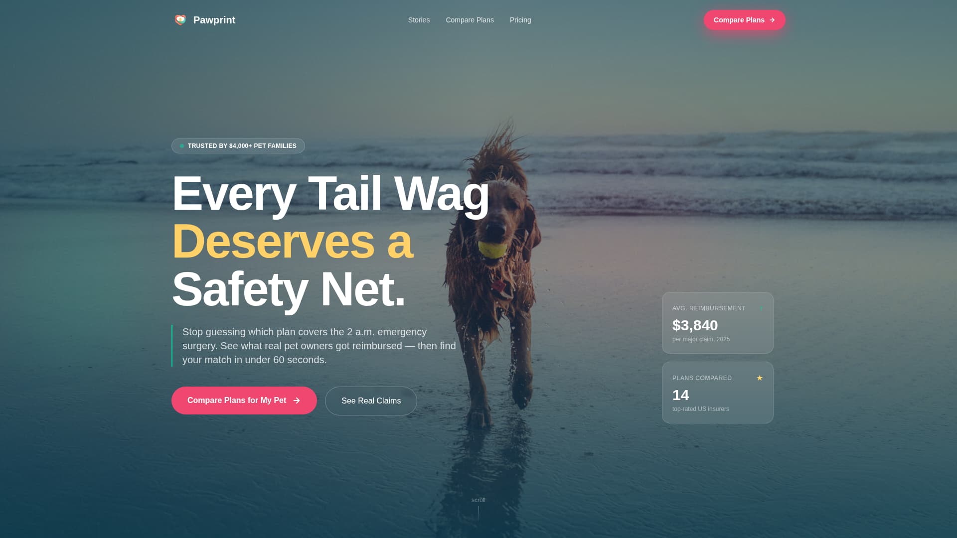 Pawprint is a pet insurance comparison landing page built on a Masonry/Pinterest layout. It pairs emotional testimonial tiles with interactive plan-comparison widgets, guiding pet owners from heartfelt stories to confident coverage decisions. A three-step progressive lead form captures pet type, age, and contact details, turning warm visitors into qualified leads without friction.