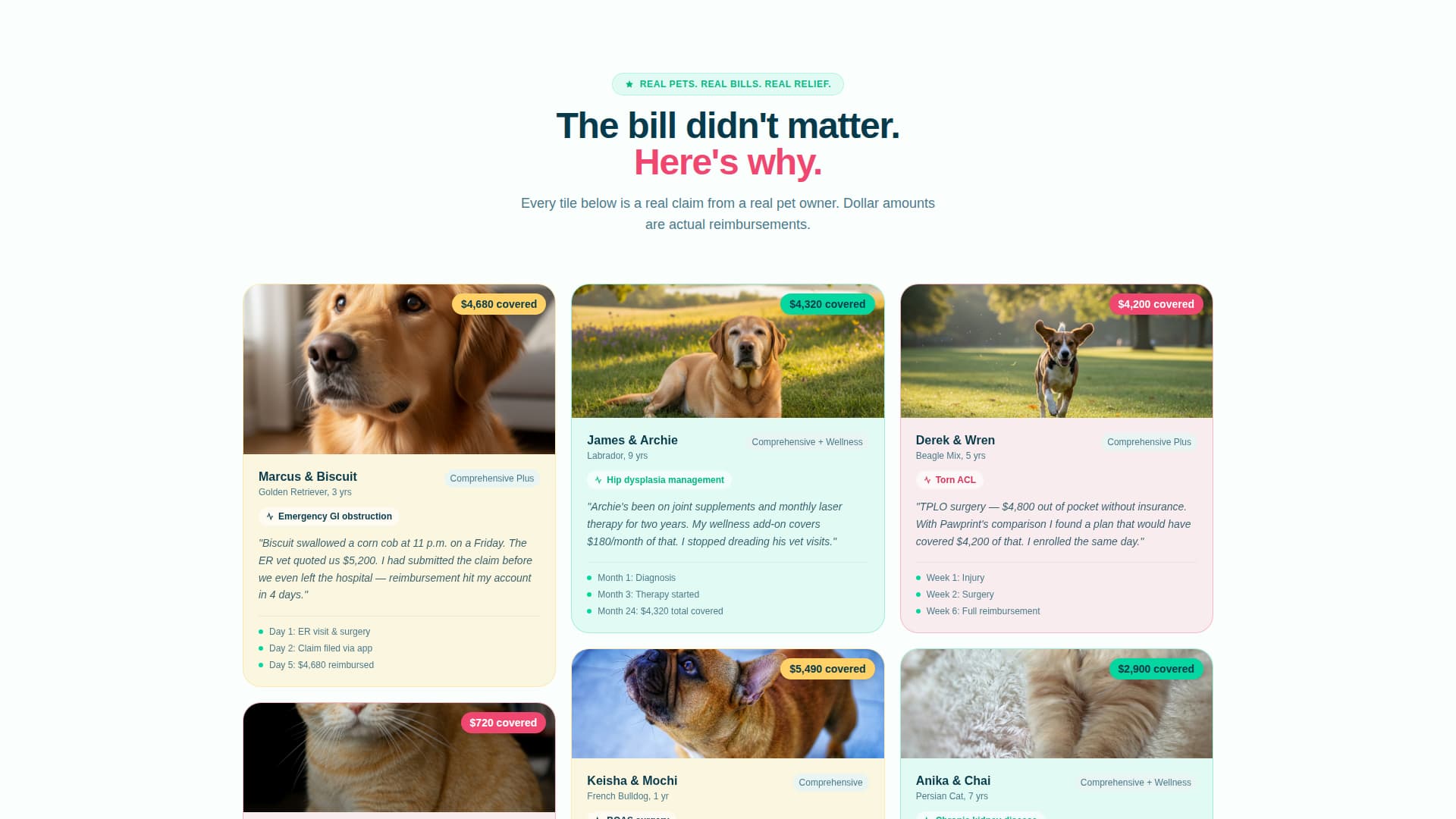 Most pet owners arrive on a comparison page overwhelmed and skeptical. They have already seen a frightening bill, or they are dreading one. Generic plan tables feel cold and confusing. This template fixes that by pairing real owner stories with rational comparison tools, so visitors feel understood before they are ever asked to commit.