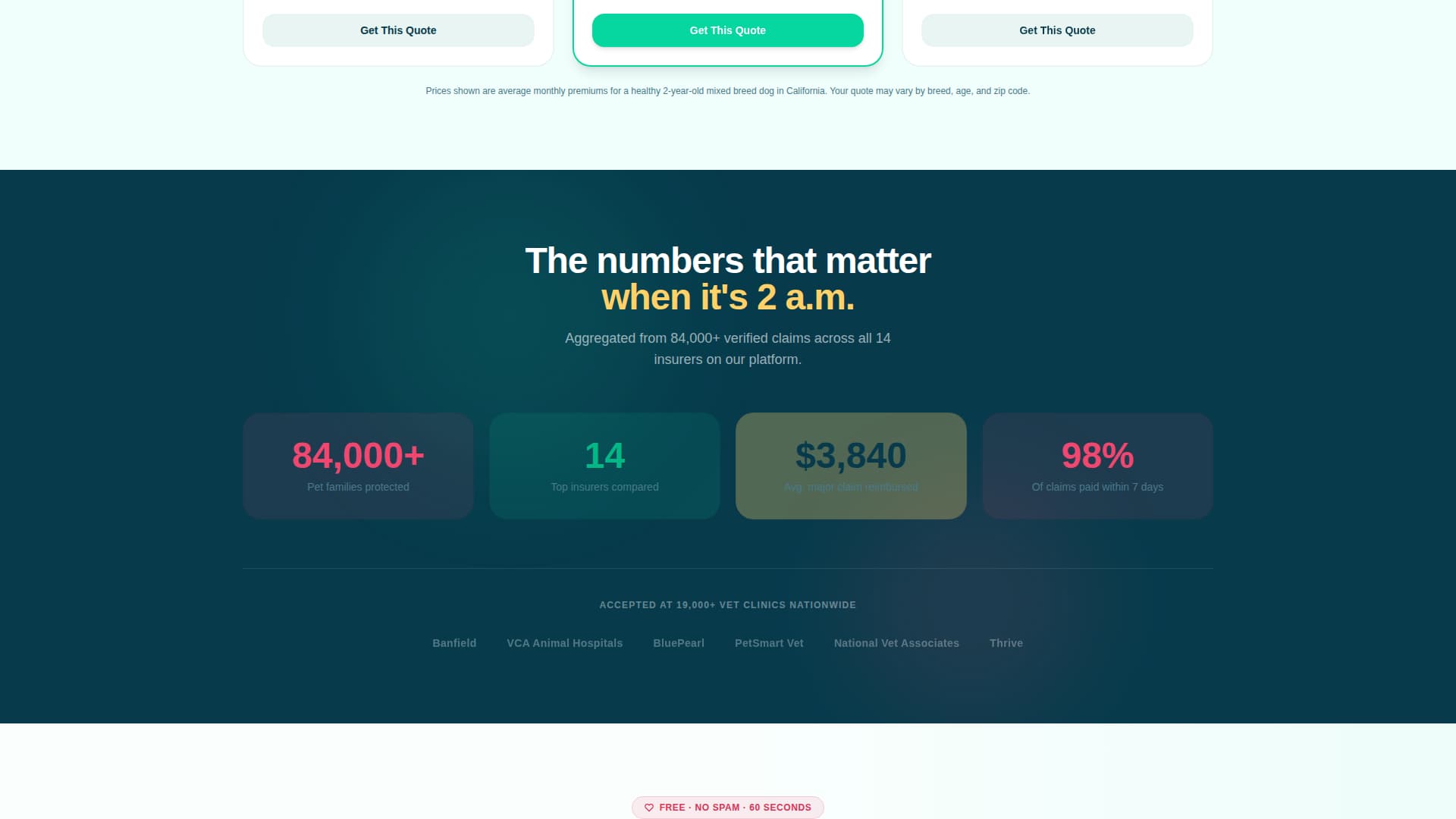 On mobile, a fixed bottom bar reads "Get Your Free Quote in 60 Seconds." It persists through the entire scroll, giving users a single-tap conversion path without requiring them to reach the main form.
