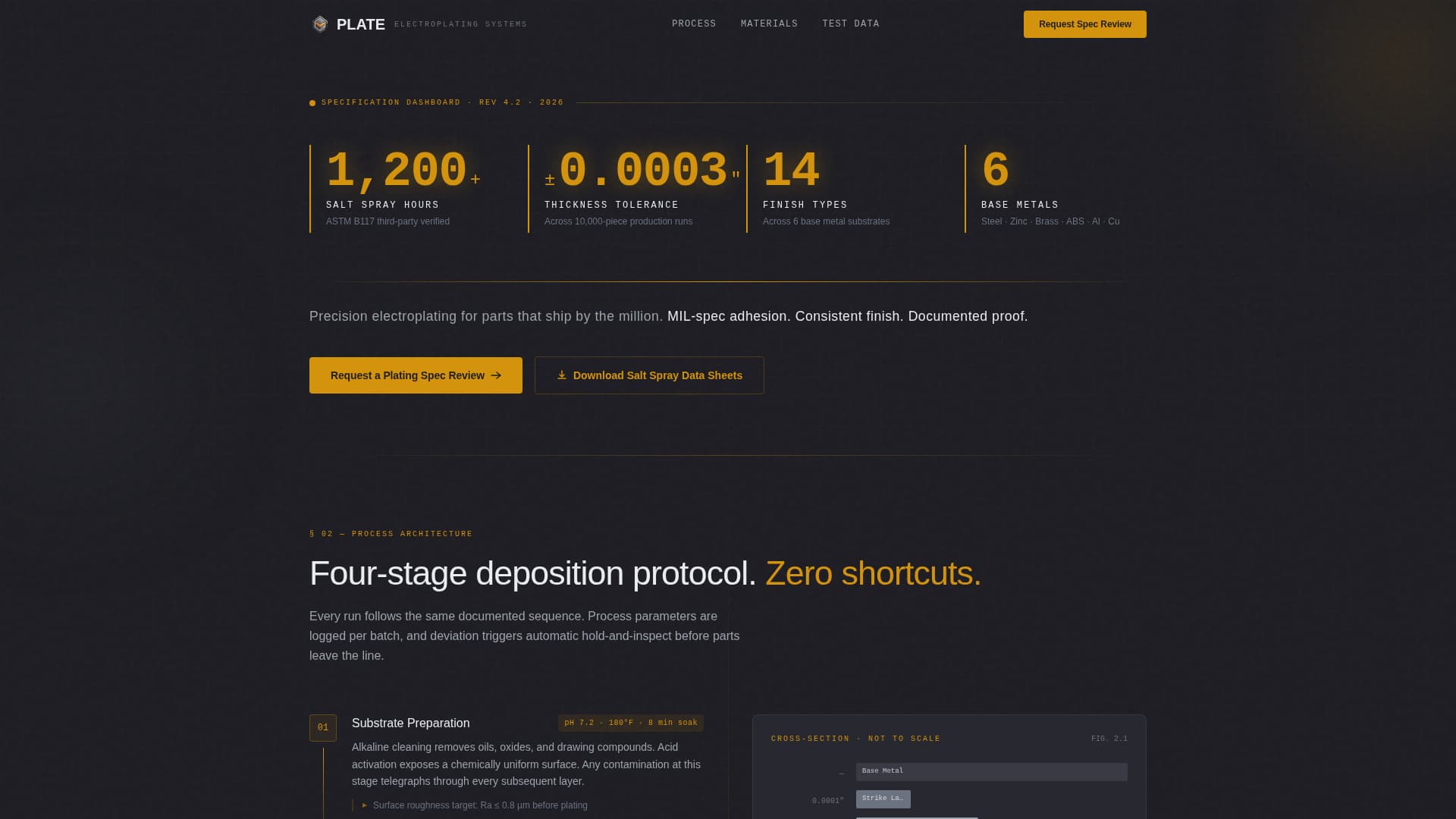 Plate is a precision-focused landing page template for industrial electroplating facilities. It leads with a stats dashboard showing key process metrics, then scrolls through technical content in an Industry Report style. The design uses deep charcoal, technical graphite, and warm amber to match a shop-floor engineering aesthetic. Two conversion paths capture both ready-to-quote engineers and earlier-stage vendors still comparing options.