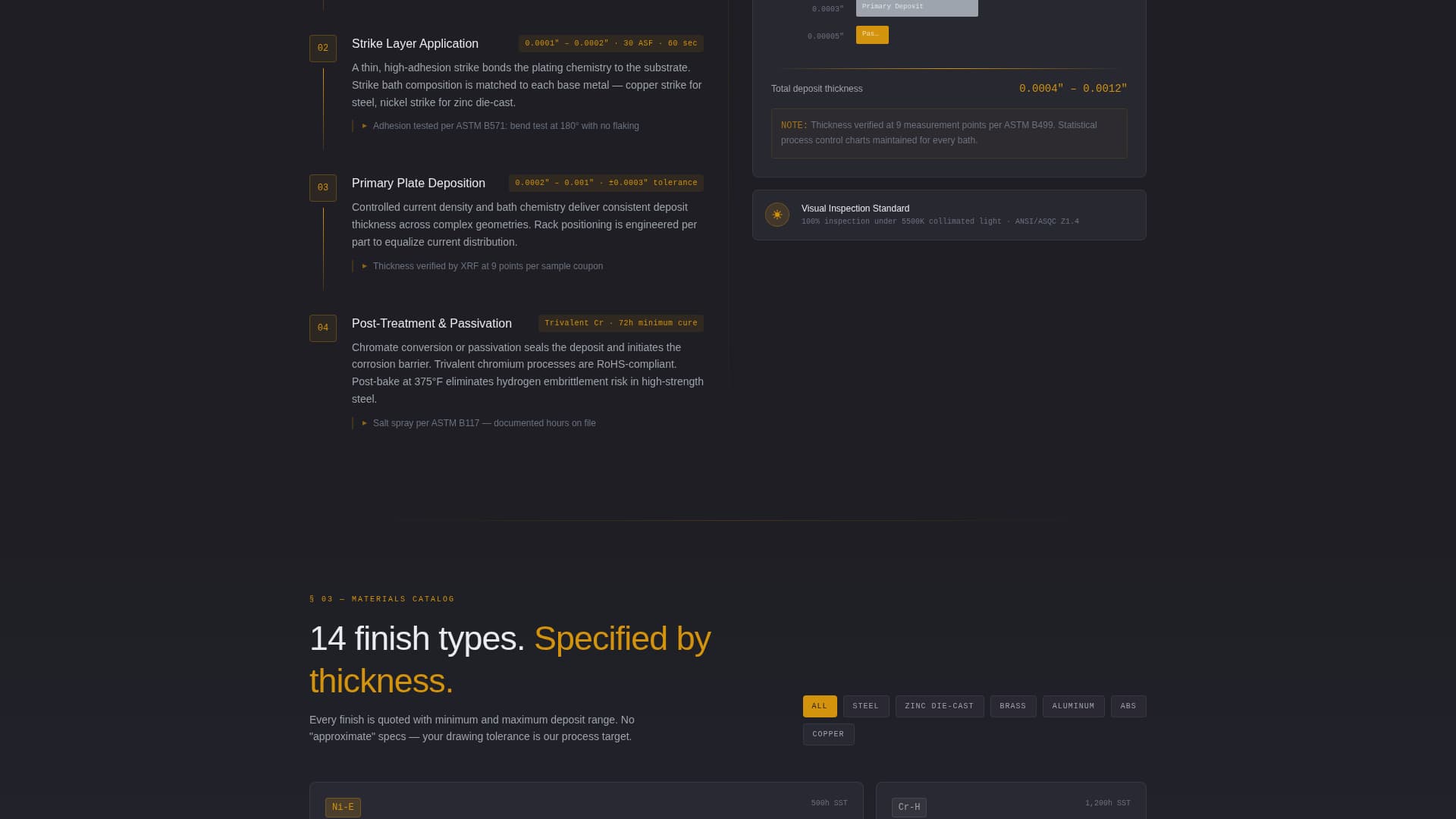 The header opens with oversized amber numerals in a monospaced typeface, counting key metrics such as salt spray hours tested, plating thickness tolerance, and finish types across base metals. A thin amber rule separates the numbers from a single-line descriptor below. There is no hero image. The data speaks first.